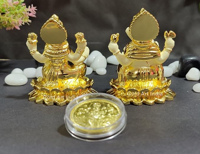 Gold Art India Kamal Laxmi Ganesh Gold Plated Off White Terracotta Idol for Home Gold Plated Coin