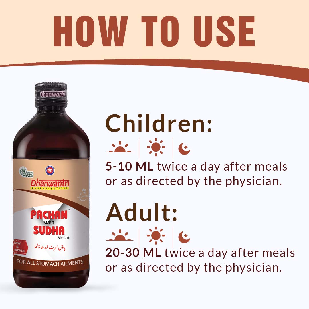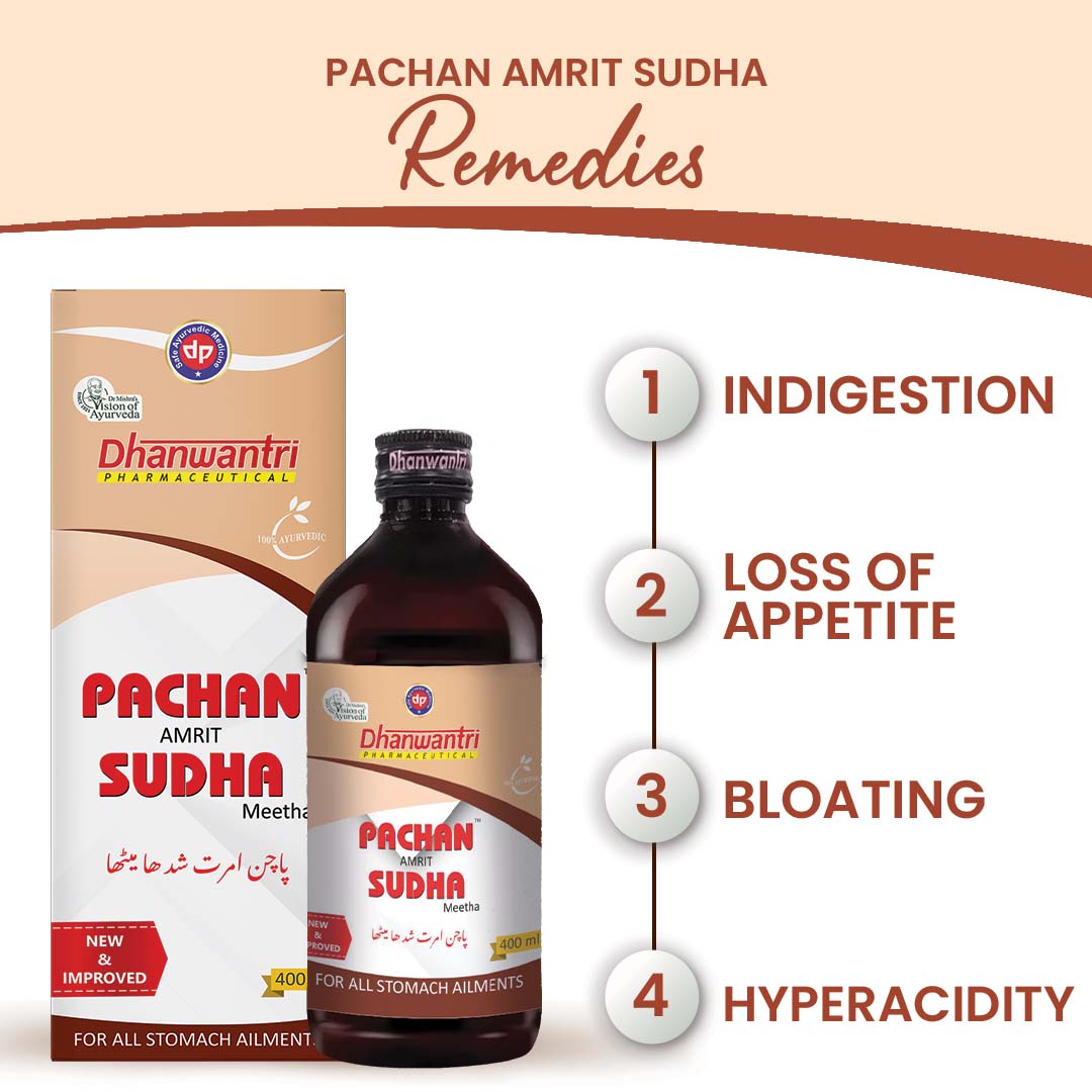 • Pachan Amrit Sudha - Meetha  is very beneficial in stomach ailments like indigestion, constipation, hyperacidity, dyspepsia, gas trouble and flatulence, drug induced gastric troubles, loss of appetite.