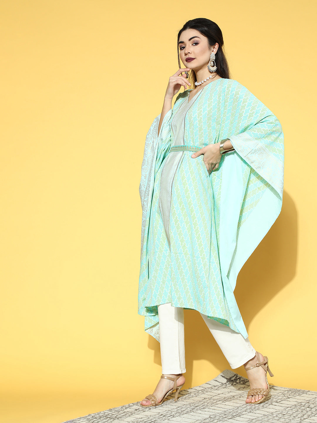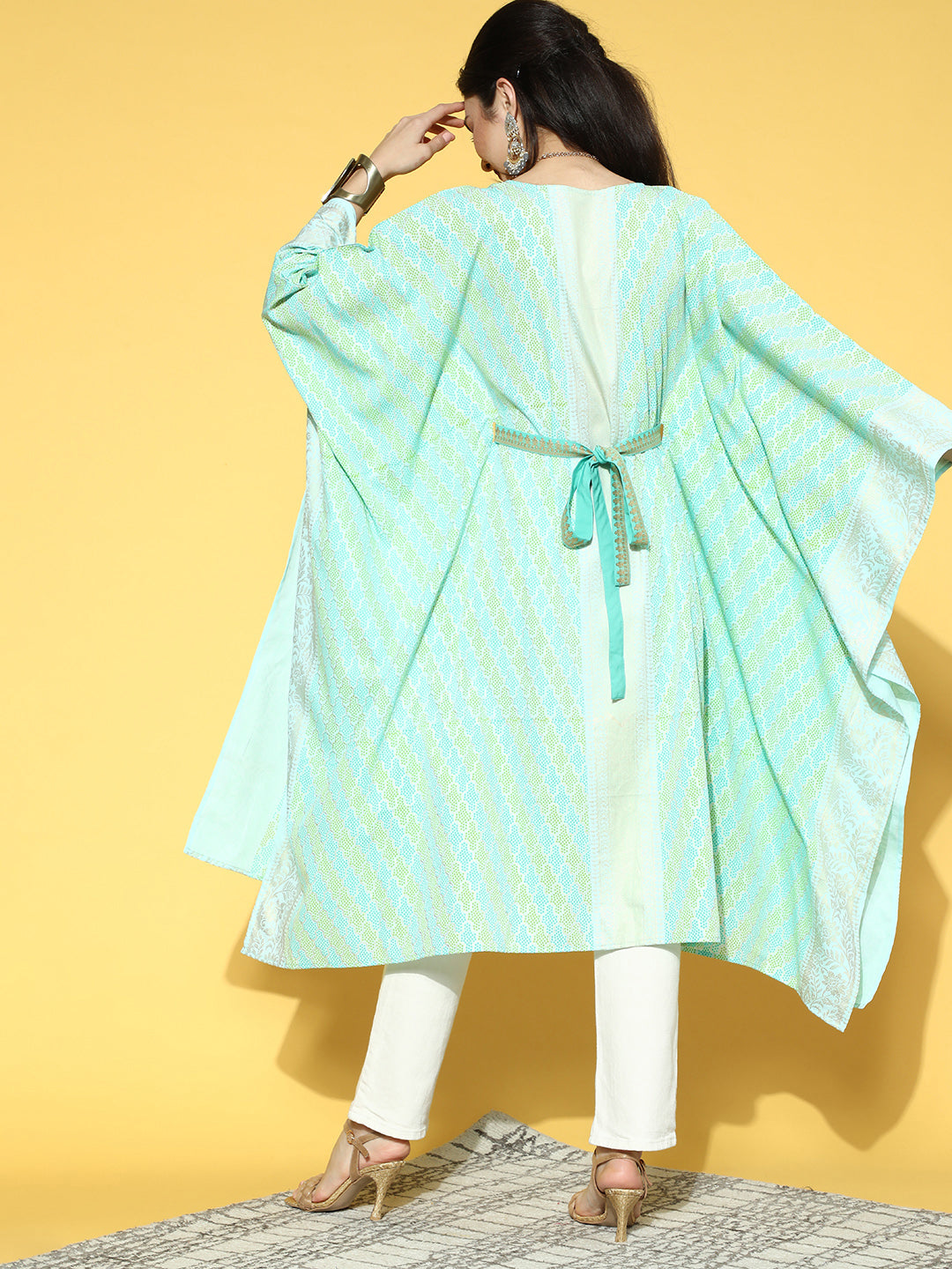 Ahalyaa Women Sea Green Crepe Printed Kaftan Kurta