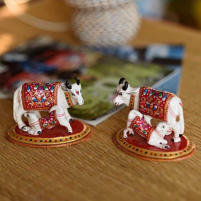 Ecraftindia Meenakari Cow and Calf Metal Figurine | Red and Black | Set of 2