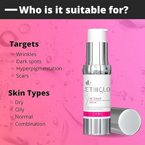 - Ethiglo skin lightening serum formula works deeply in the skin to whiten and reduce wrinkles, dark spots, and hyperpigmentation, scars, discoloration, Brightening and smoother skin tone.;Improves pigmentation, dark spot, sun damage skin.