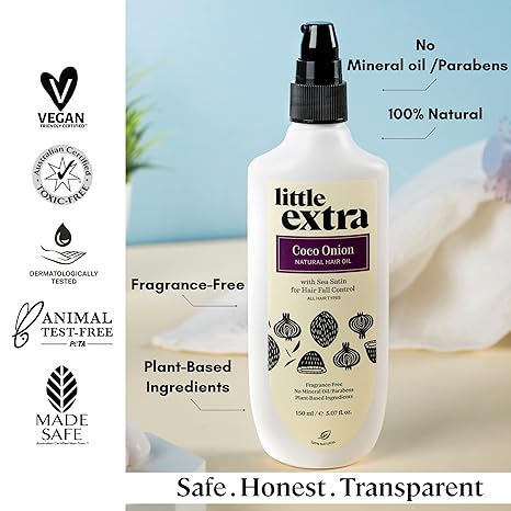 - CERTIFIED HAIR OIL - Little Extra Coco Onion Hair Oil is one of the few natural hair oils to be Certified, Made Safe, Australian Certified Toxic-Free & Allergy Certified. It's FDA-approved, Dermatologist tested without mineral oil, paraben, fragrance, SLS & artificial color