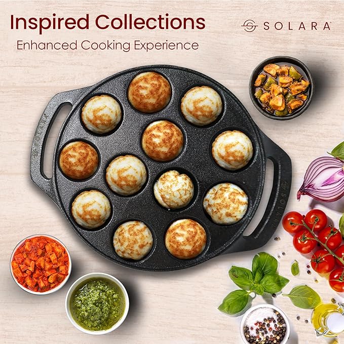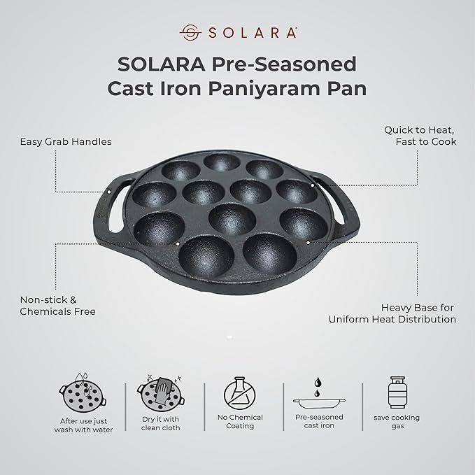 Solara Pre Seasoned Cast Iron Paniyaram Pan 12 Cavities 20 Cm Appam Patra, Paniyarakkal Pan | Cast Iron Cookware