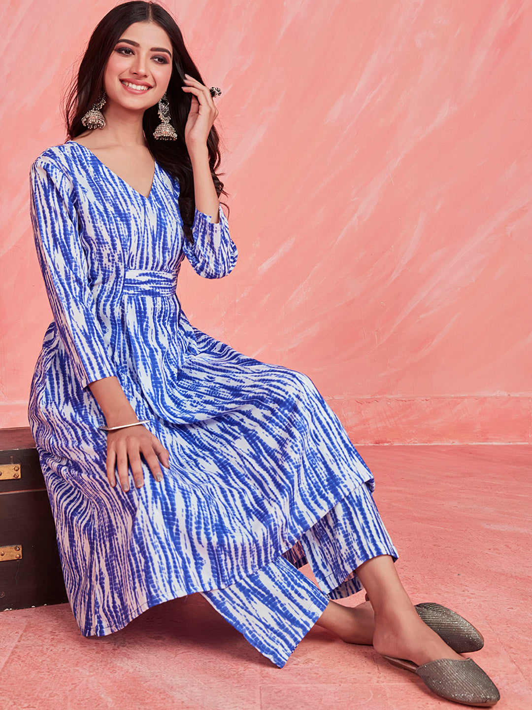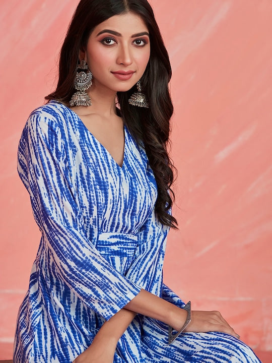 • Blue & white printed Kurta with Trousers