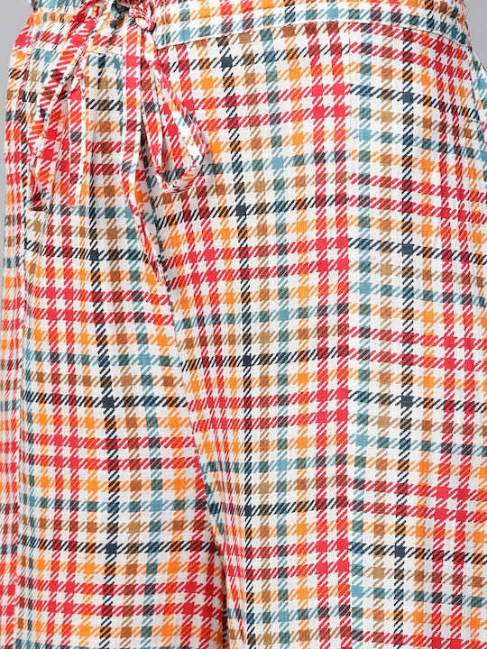 • Red, blue and yellow houndstooth patterned palazzos, has a partially elasticated waistband with drawstring closure