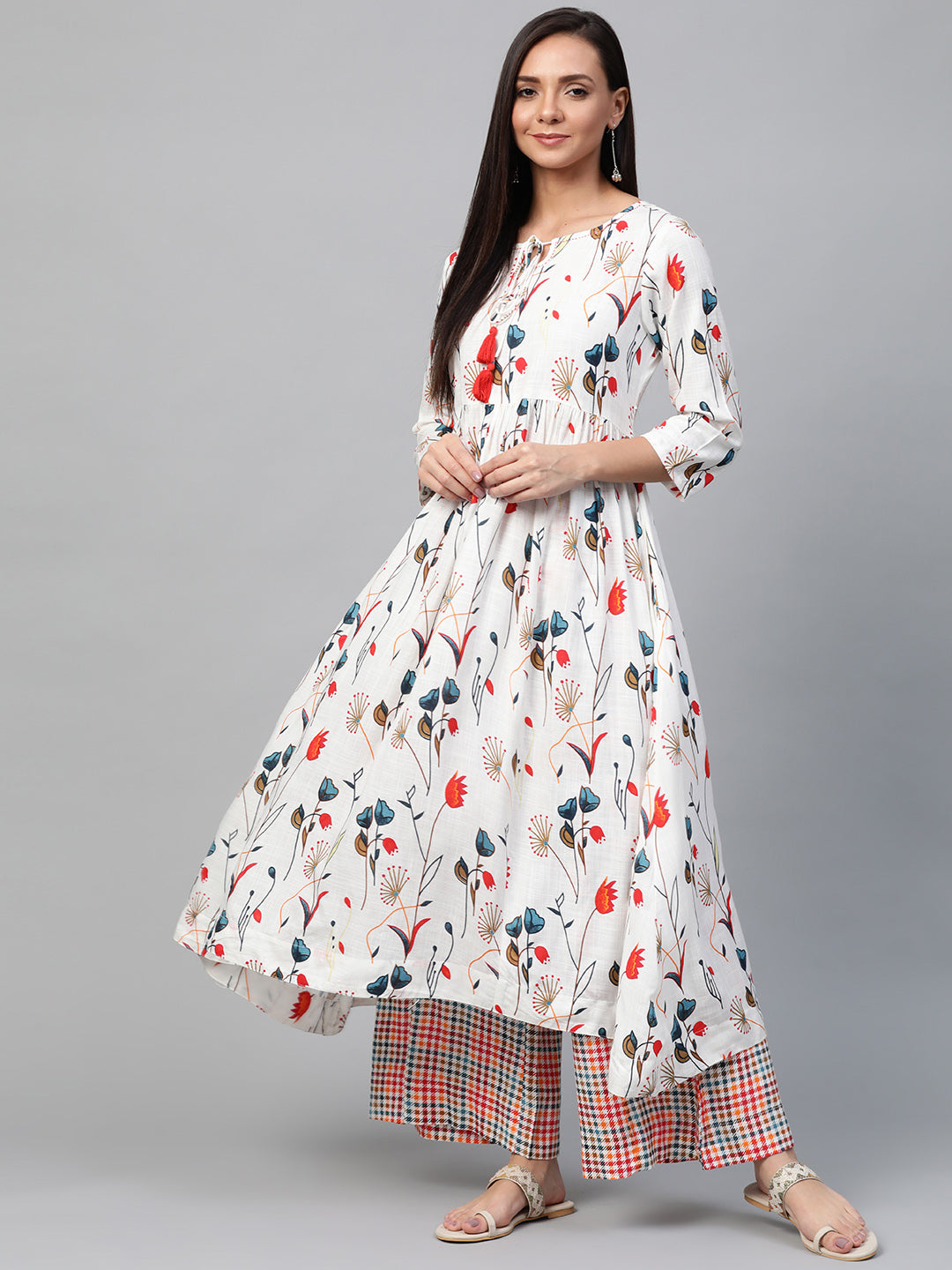 • White, red and blue printed A-line calf length kurta, has a tie-up neck, three-quarter sleeves, flared hem, two pockets