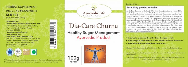 - Dia care Ayurvedic formulation is synergistically processed with highly advanced technology. The herbs in Dia-Care Churna are specially selected and manually graded to give the best products.