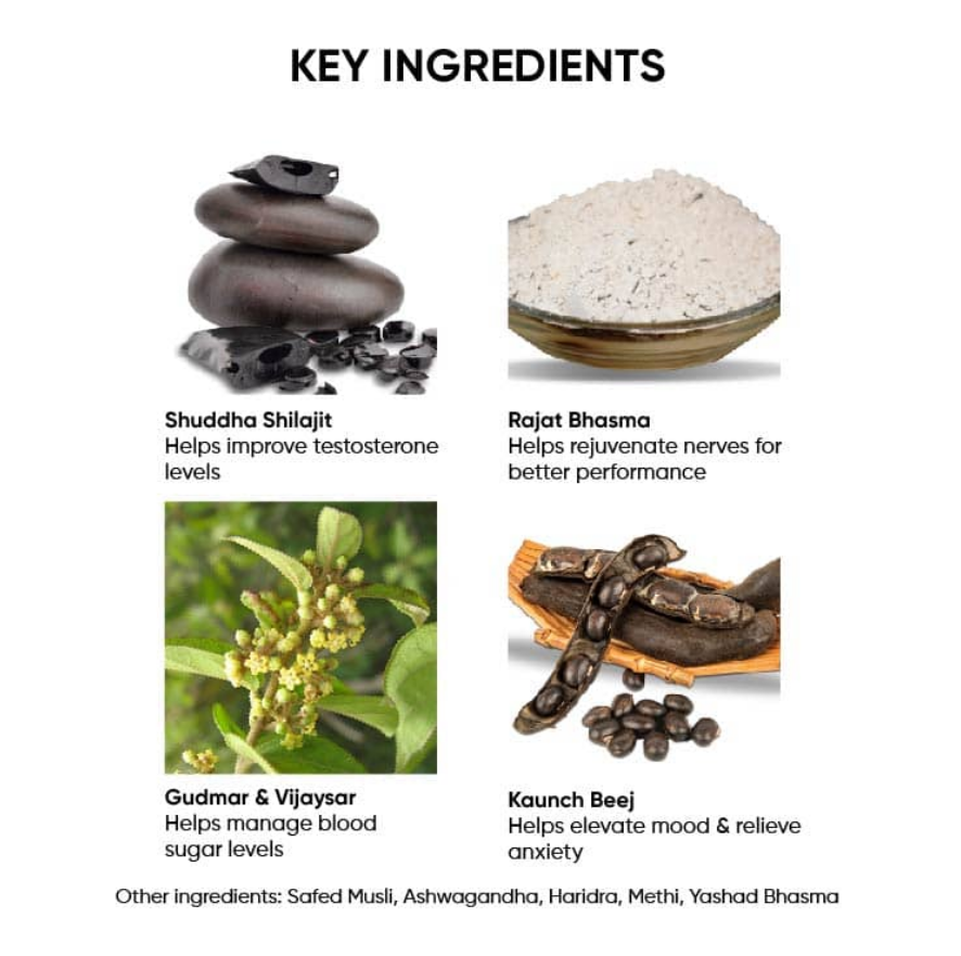 • Shuddha Shilajit: Believed to contribute to testosterone levels & assist in managing sugar levels
