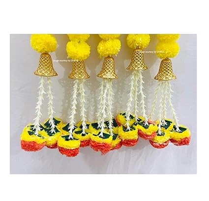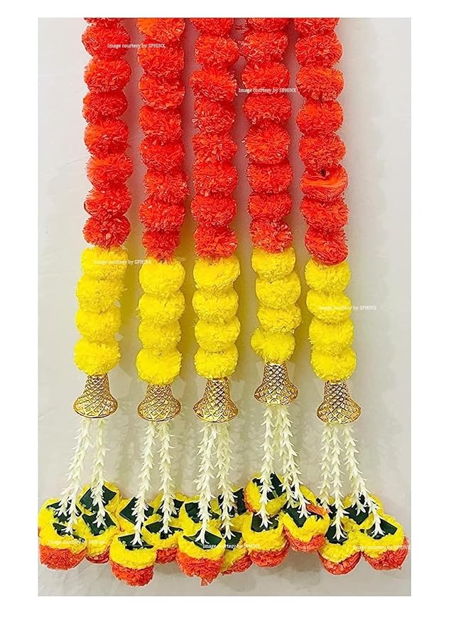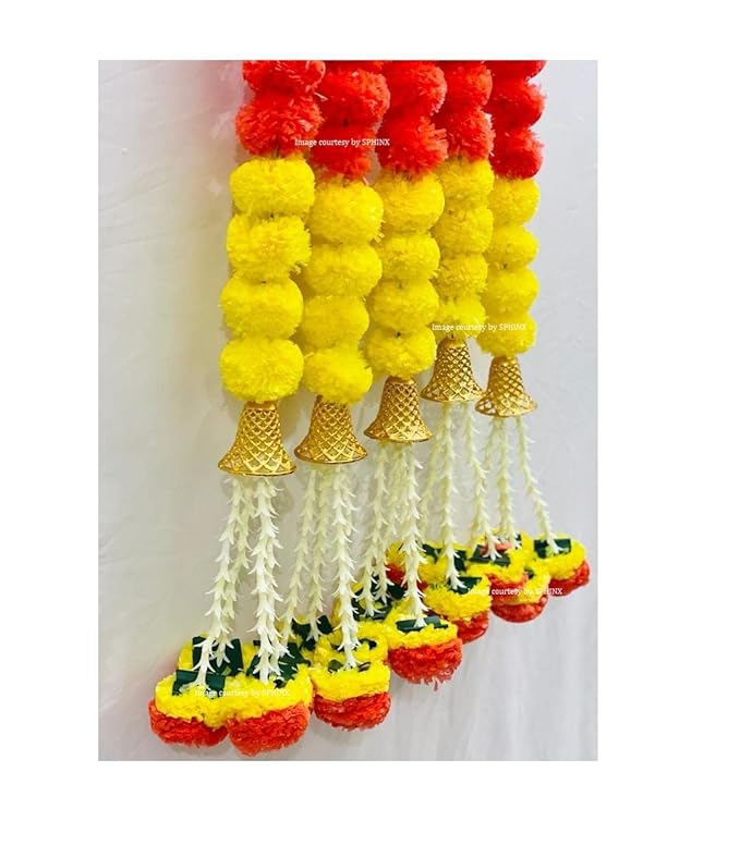 • Offer contains- Sphinx artificial marigold fluffy flowers with Decorative Bell and clustered tuberose/rajnigandha/ bhonga flowers garlands/strings for festive pooja wedding housewarming decorations Approx.5 ft as per selected colour and quantity.