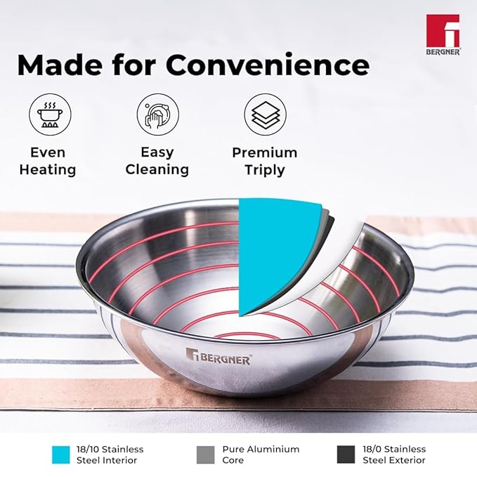 - Less Oil Use & Low Flame Cooking : The triply material heats evenly and reduces hot spots, preventing food from burning or sticking.