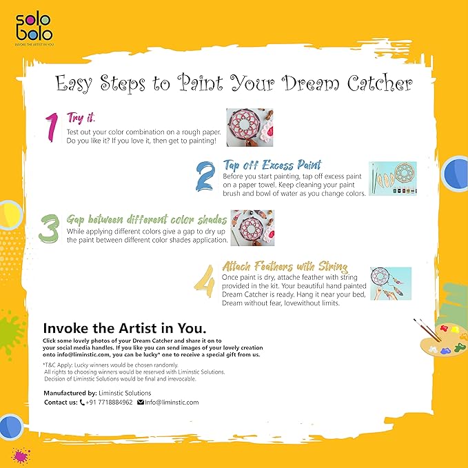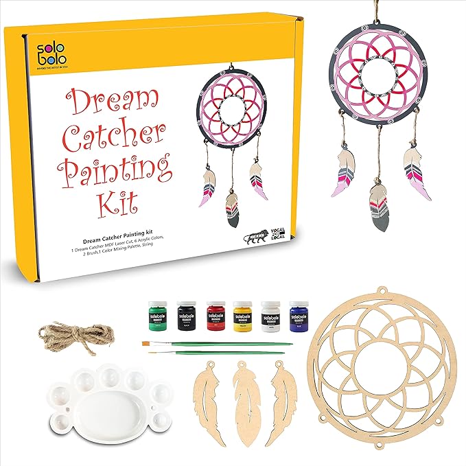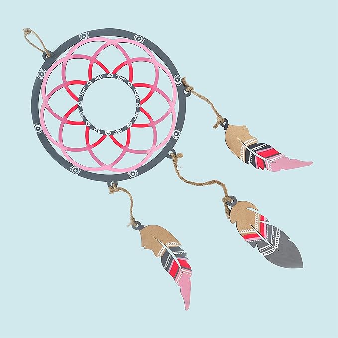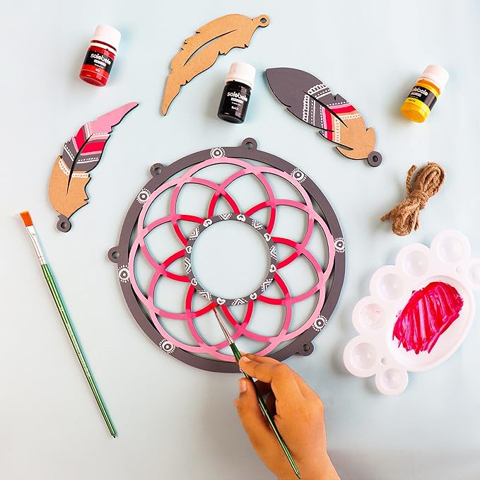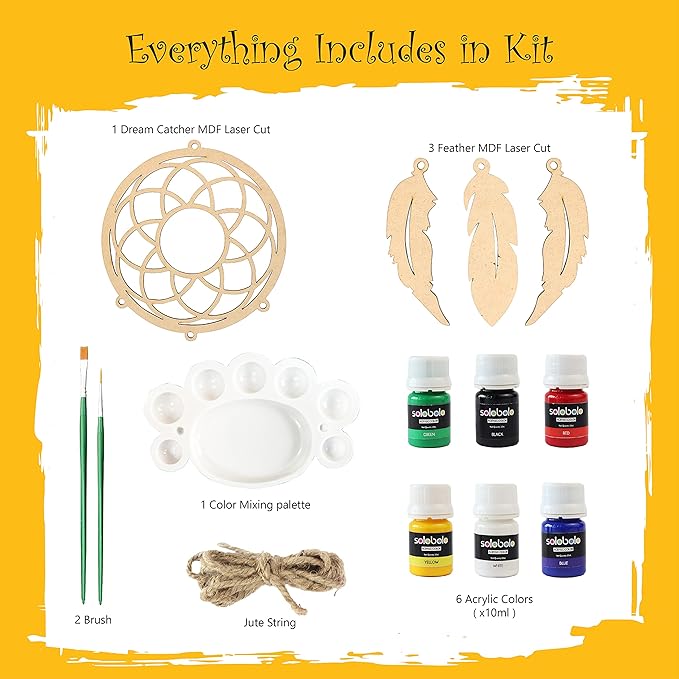 • ECO-FREINDLY DREAM CATCHER KIT  : This Dream catcher making kit includes 1 dreamcatcher laser cut mdf  8 Inch ring,3 feathers for dream catcher ,6 acrylic colors of 10ml each, 2 painting brushes, 1 color mixing plate and string to tie the feathers.