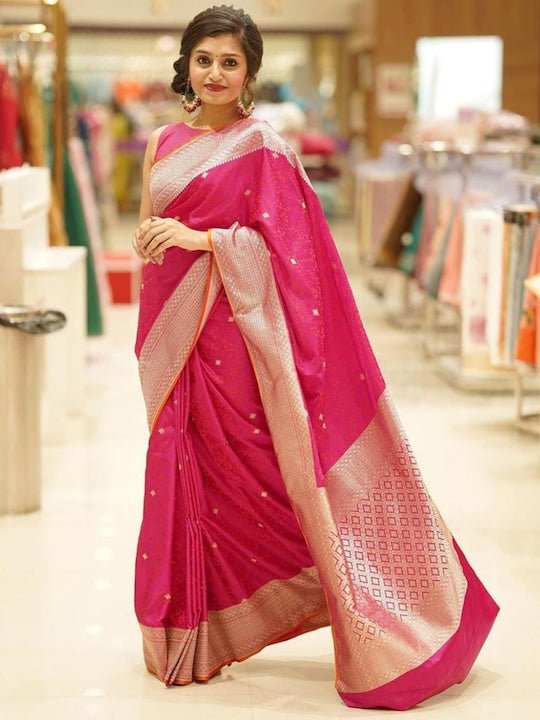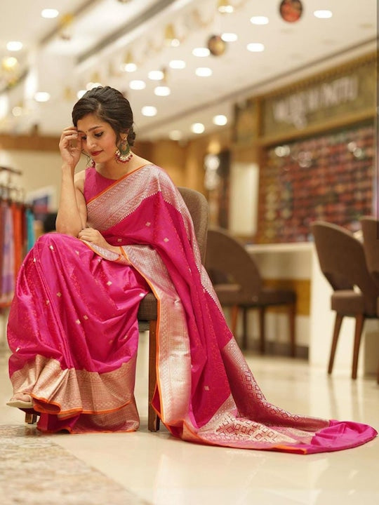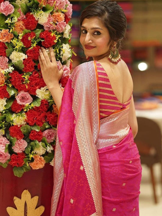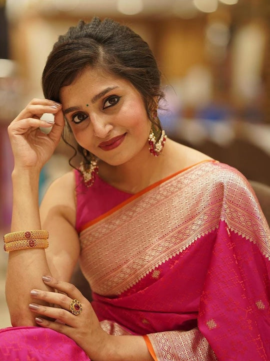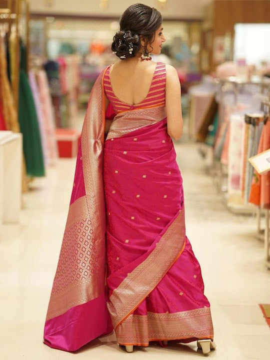 • Pink and gold-toned banarasi saree