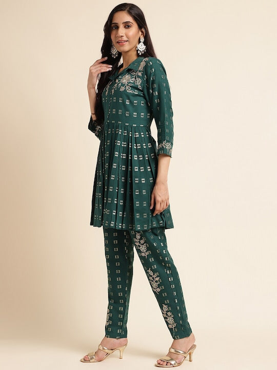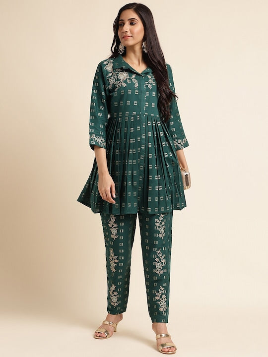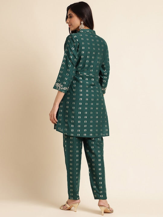 Fabmora Ethnic Motif Woven Design Thread Work Organic Cotton A-Line Kurta & Trousers