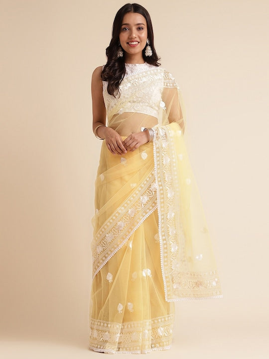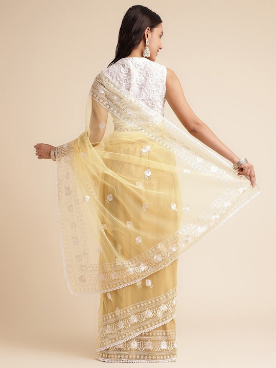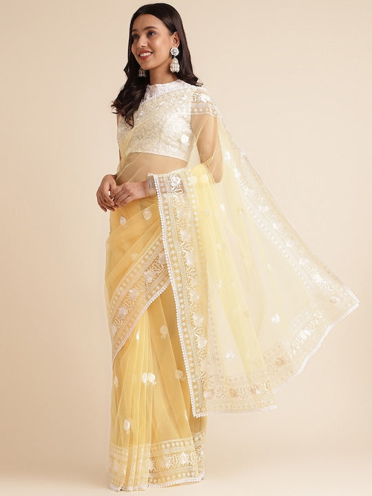 Fabmora Ethnic Motifs Embroidered Net Saree