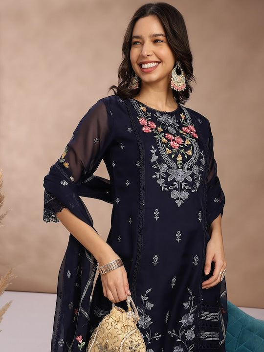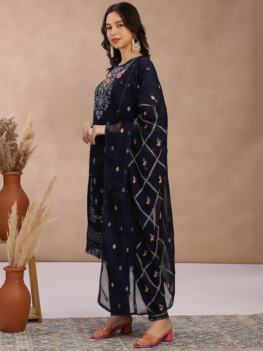 Fabmora Women Floral Embroidered Regular Kurta with Trousers & With Dupatta