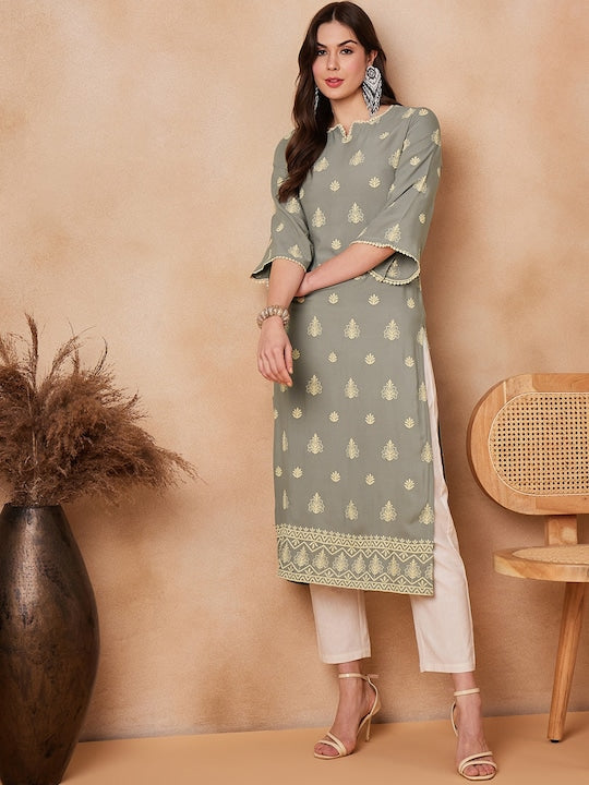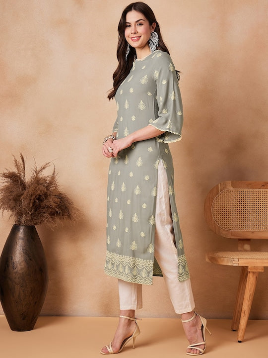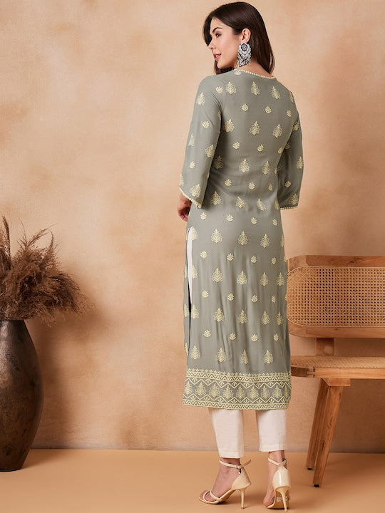 House of Pataudi Ethnic Motifs Embroidered Pure-Cotton Straight Kurta