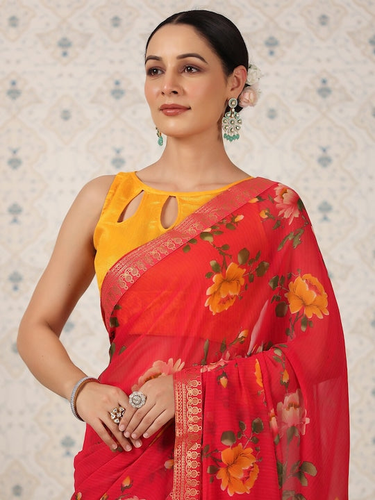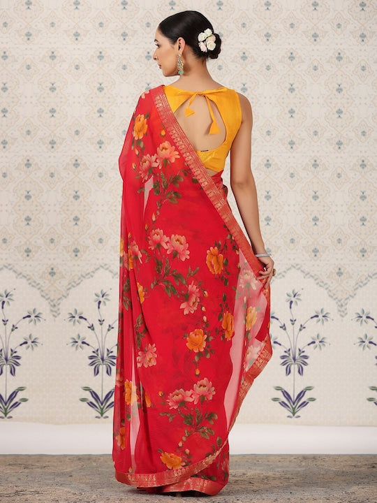 House of Pataudi Red & Yellow Floral Printed Zari Poly Georgette Saree