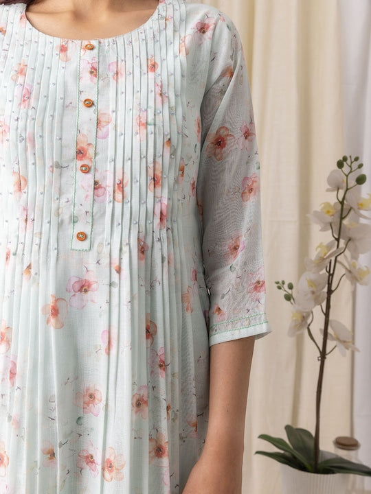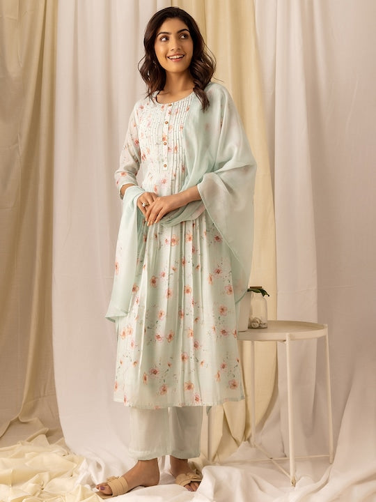 House of Pataudi Turquoise Blue Floral Printed Flared A-Line Kurta With Trouser & Dupatta