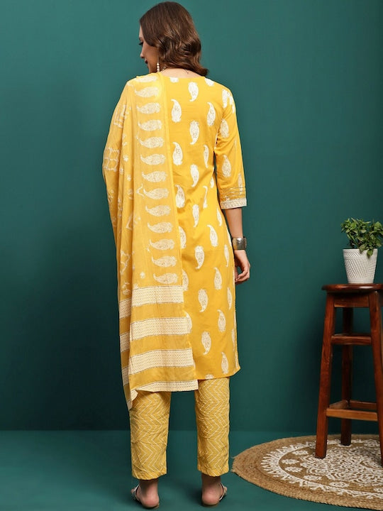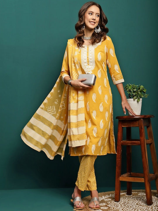 Sangria Paisley Printed Embroidered Pure Cotton Straight Kurta With Trouser & Dupatta Set