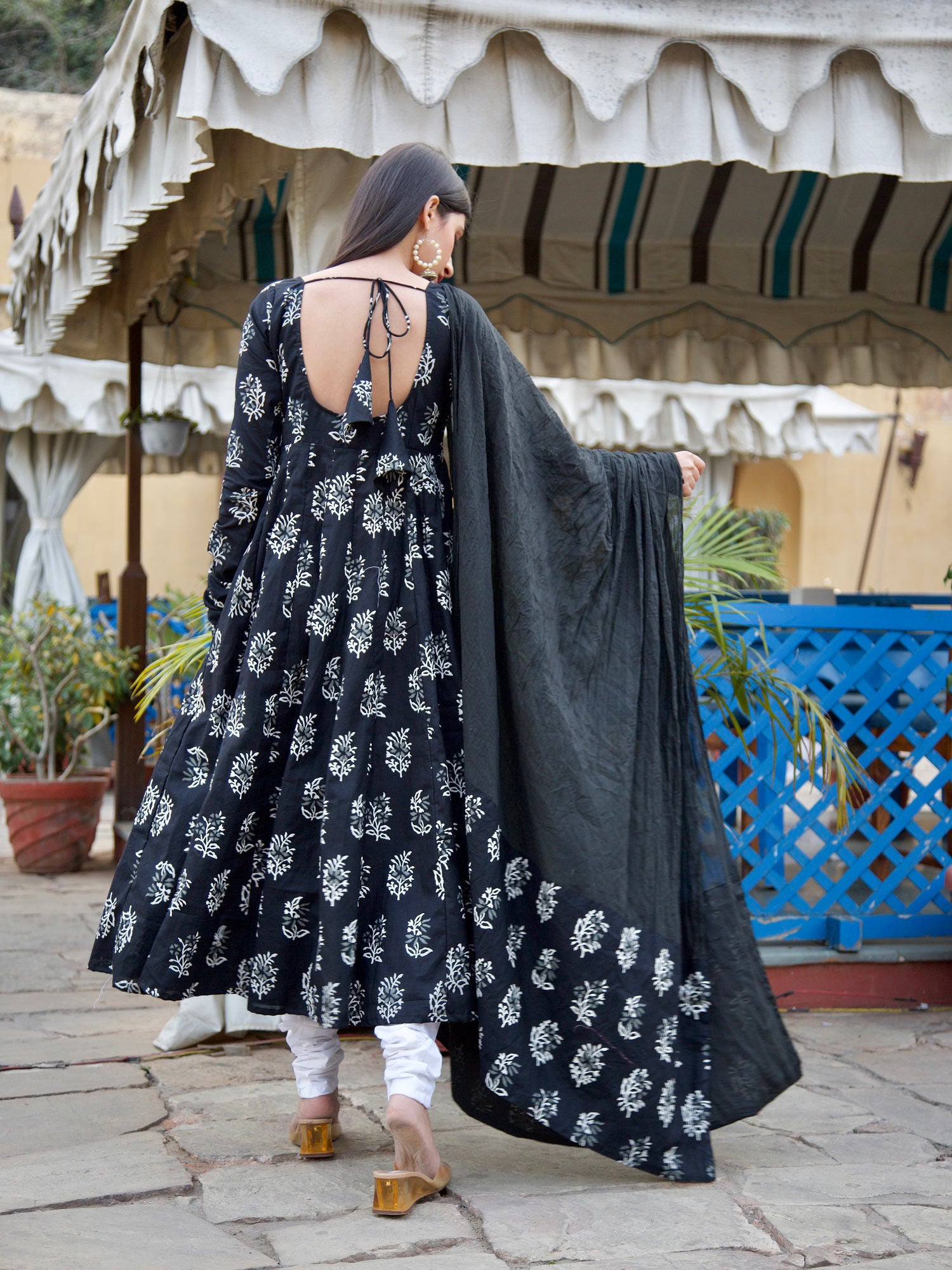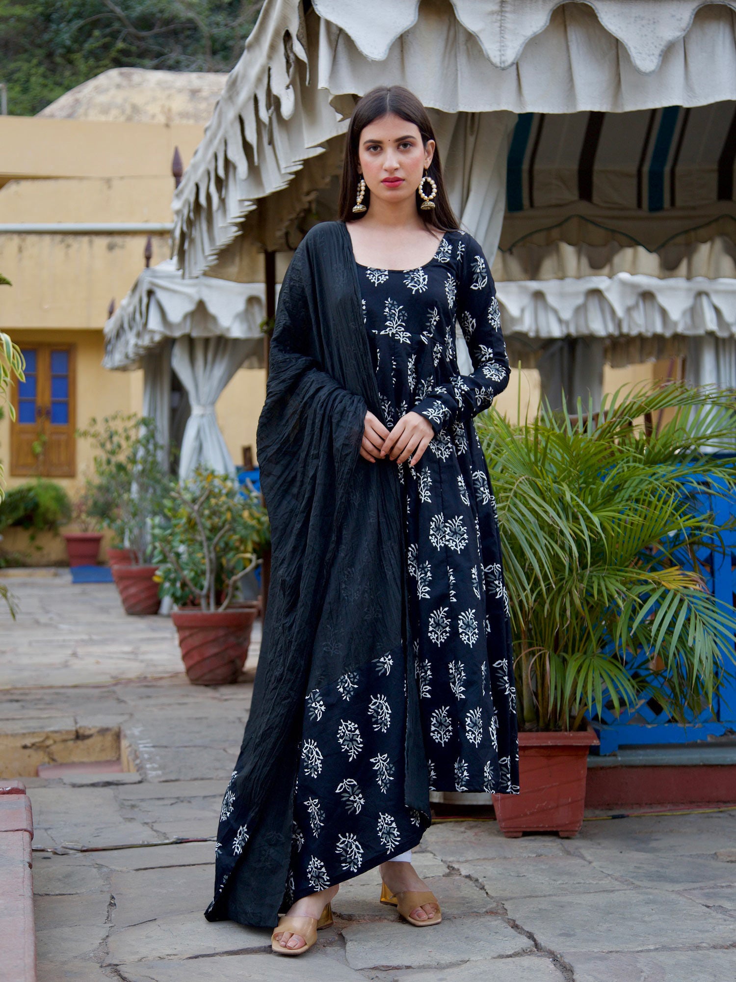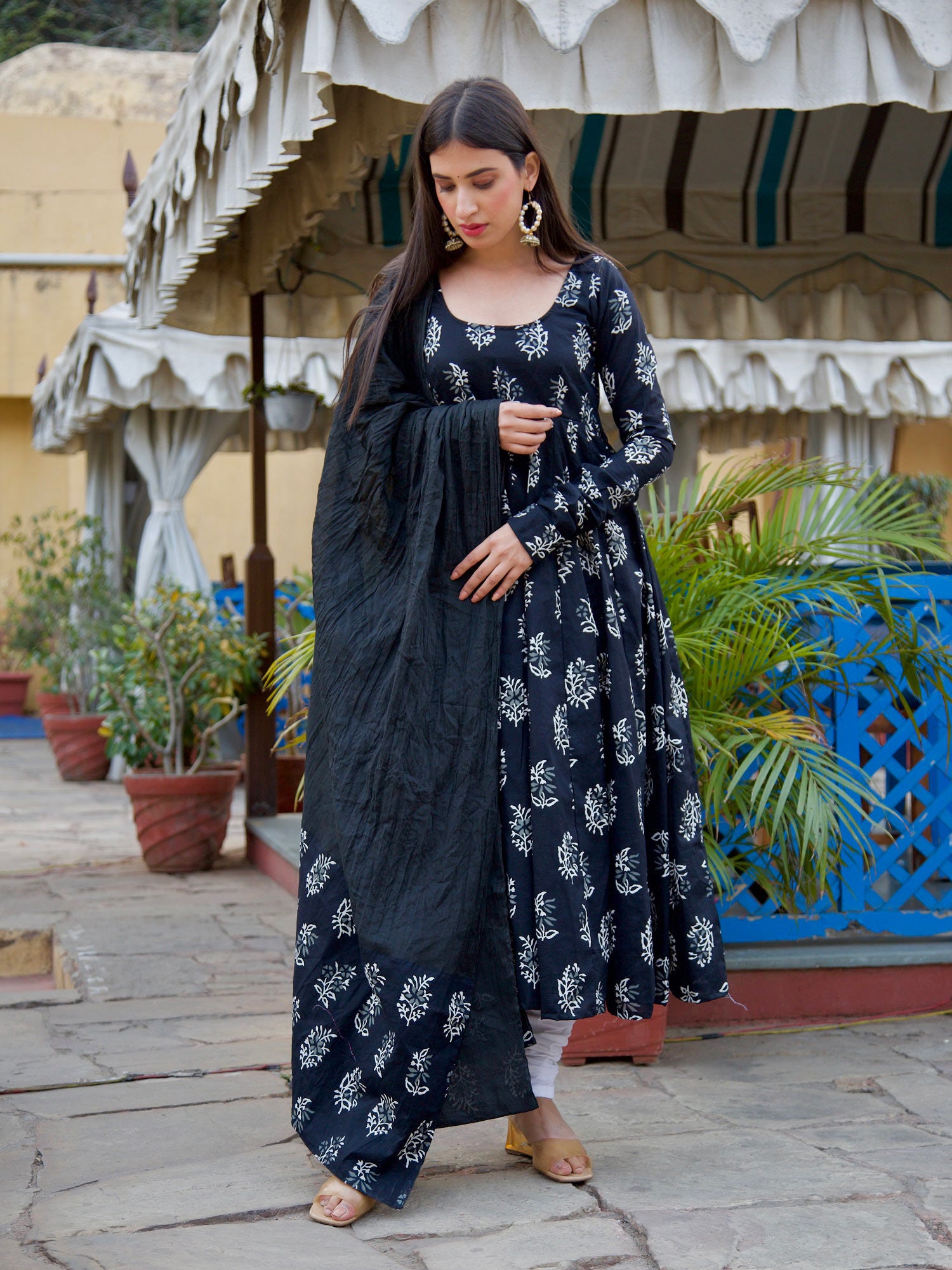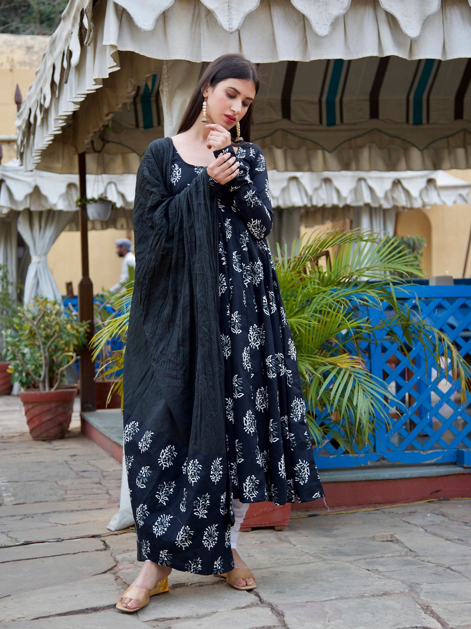 - This black printed Anarkali set by ONEWE India is a versatile and elegant option for any event.