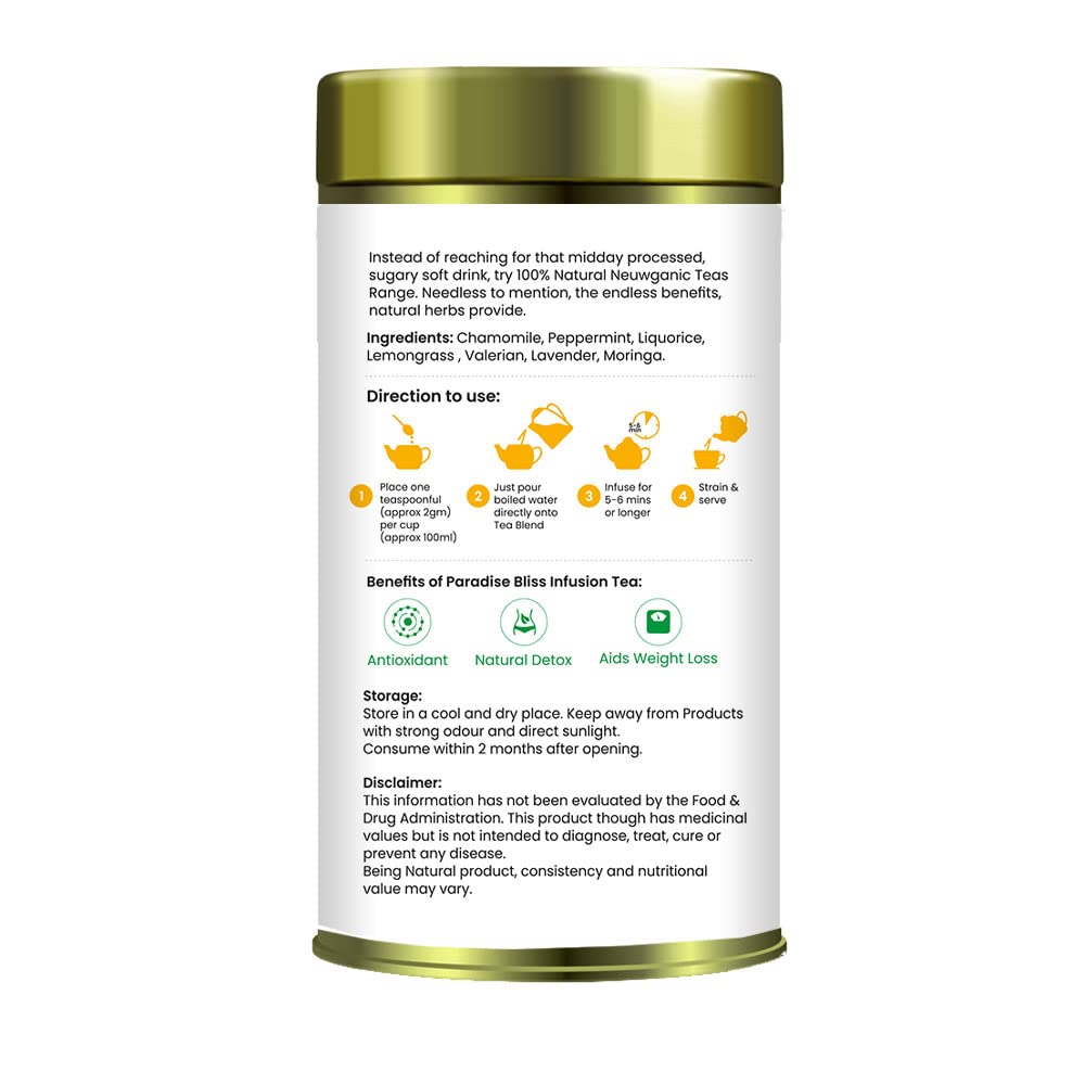 - All Natural Tea: Enjoy 50 cups of pure goodness with no preservatives, gluten, or caffeine in Neuwganic Paradise Bliss Infusion Tea