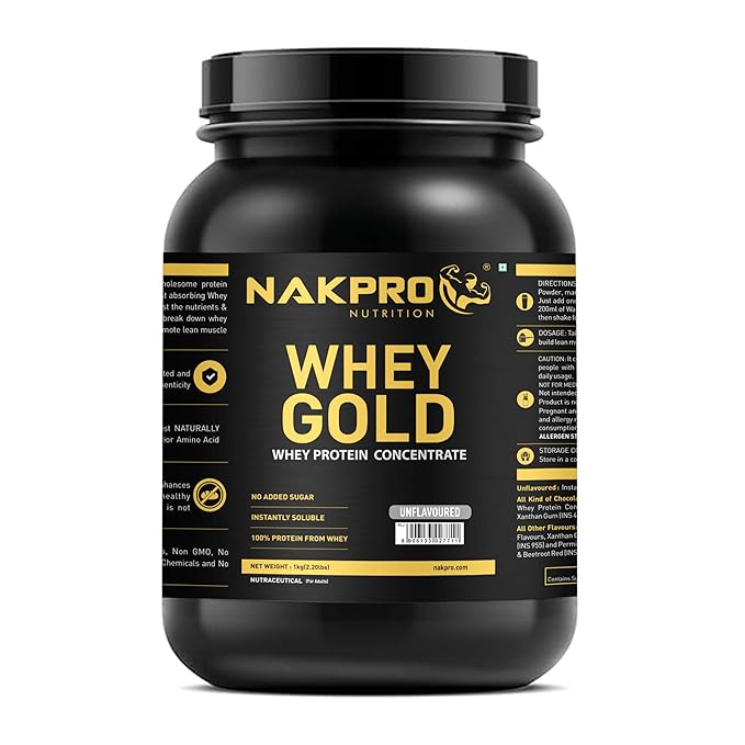 • NAKPRO GOLD WHEY PROTEIN is 100% Imported Whey Protein Concentrate supplement powder and delivers 28g of protein per 35g serving size. Protein makes an essential component of your diet.