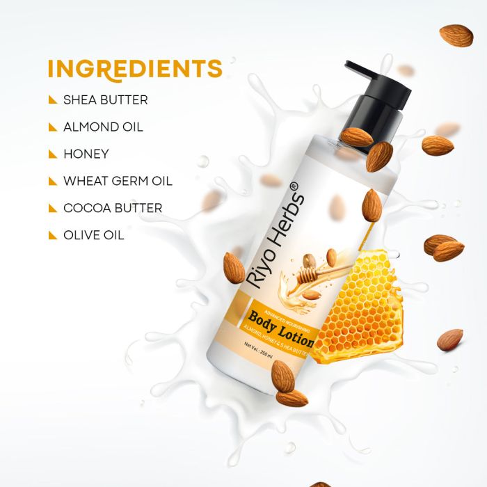 - Riyoherbs Body Lotion comes with the goddness of almond,honey, shea butter, which is a non greasy formula that gets absorbs quickly into the skin and keeps it hydrated all day.