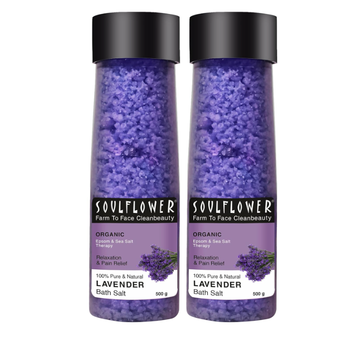 • Soulflower lavender bath salt is enriched with lavender essential oil and helps in muscle pain relief. Lavender bath salt deeply cleanses the skin, controls acne, and has a soothing aroma.