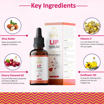 - 7 Days Lip Serum has been made with the best blend of natural ingredients to soothe dry lips, lighten darkness, improve their texture & keep them plumped up and hydrated at all times.