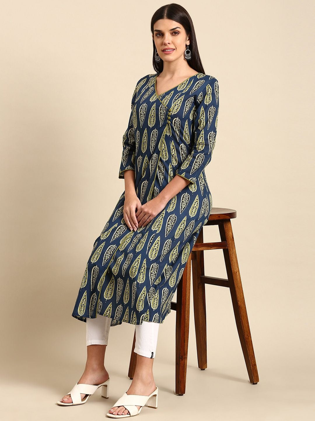 Anayna Women Navy Blue & Green Ethnic Motifs Printed Cotton Kurta