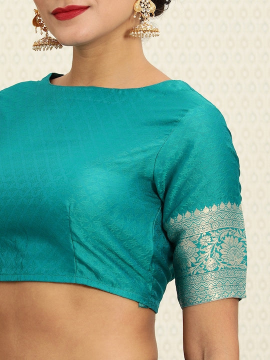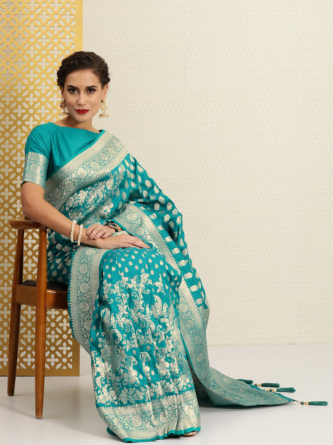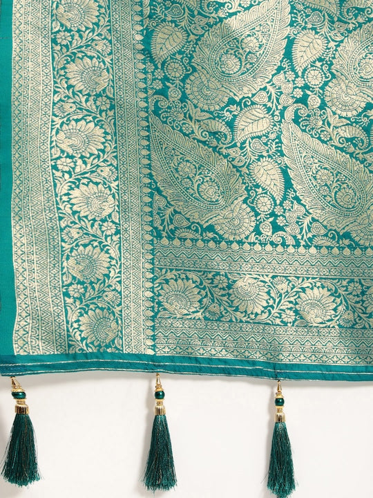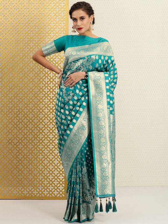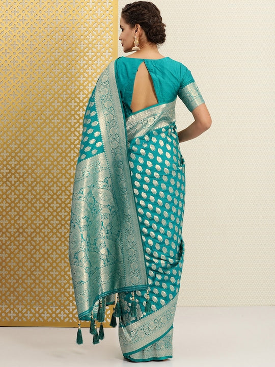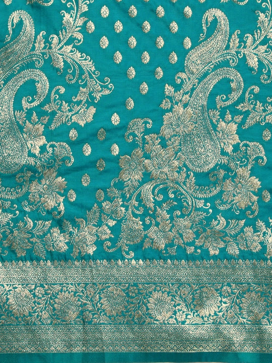 House of Pataudi Teal & Gold-Toned Ethnic Motifs Zari Silk Blend Banarasi Saree