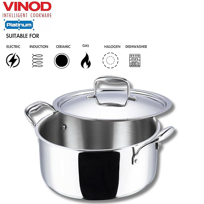 Vinod Platinum Triply Stainless Steel Saucepot With Stainless Steel Lid 4 Litres Capacity | 22 Cm Diameter | With Riveted Handles | Silver