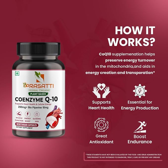 • Supports Heart Health: Prasatti Herbal Organic Coenzyme CoQ10 Supplement Capsule helps maintain cardiovascular health by improving energy production in heart cells.
