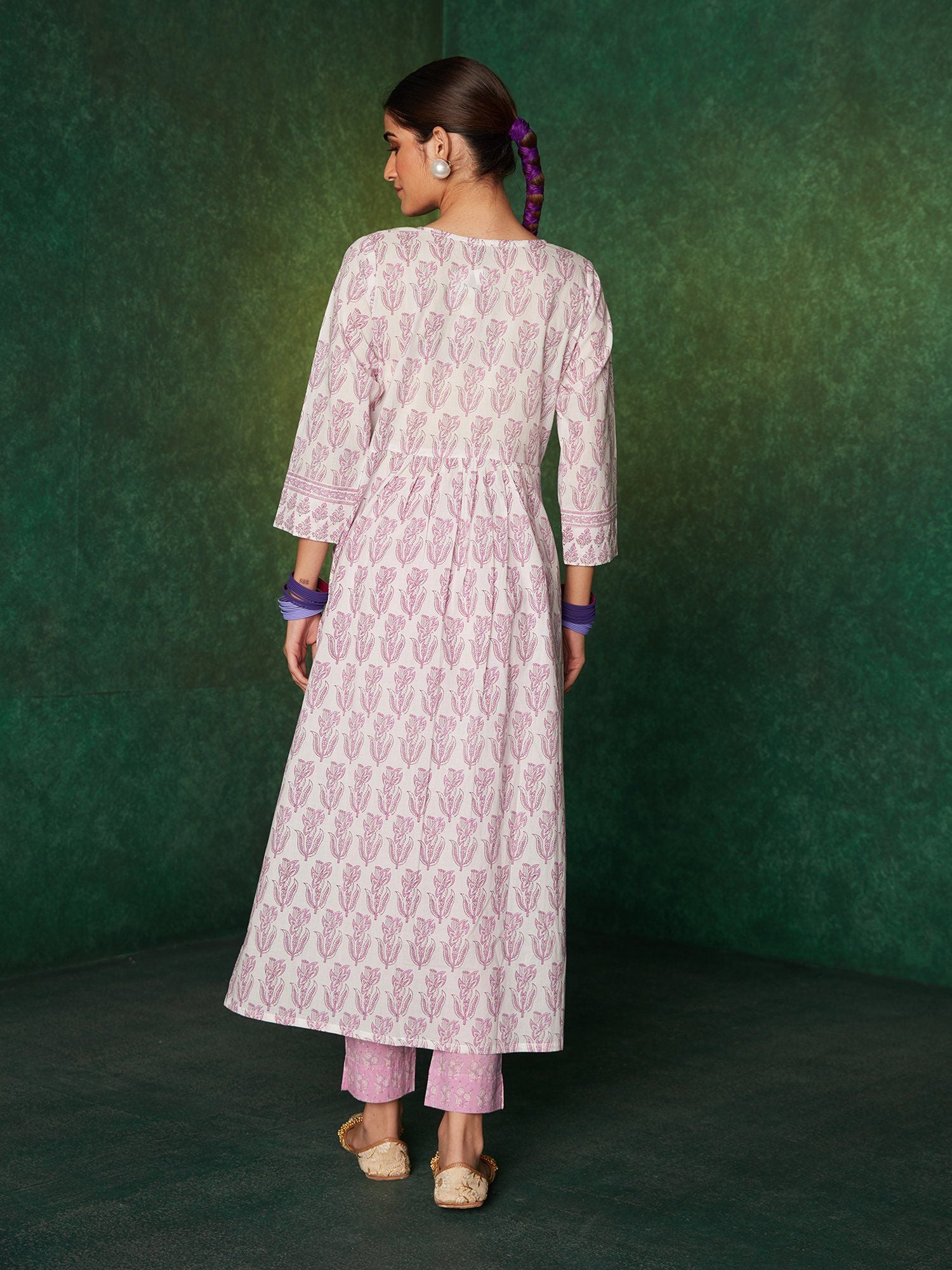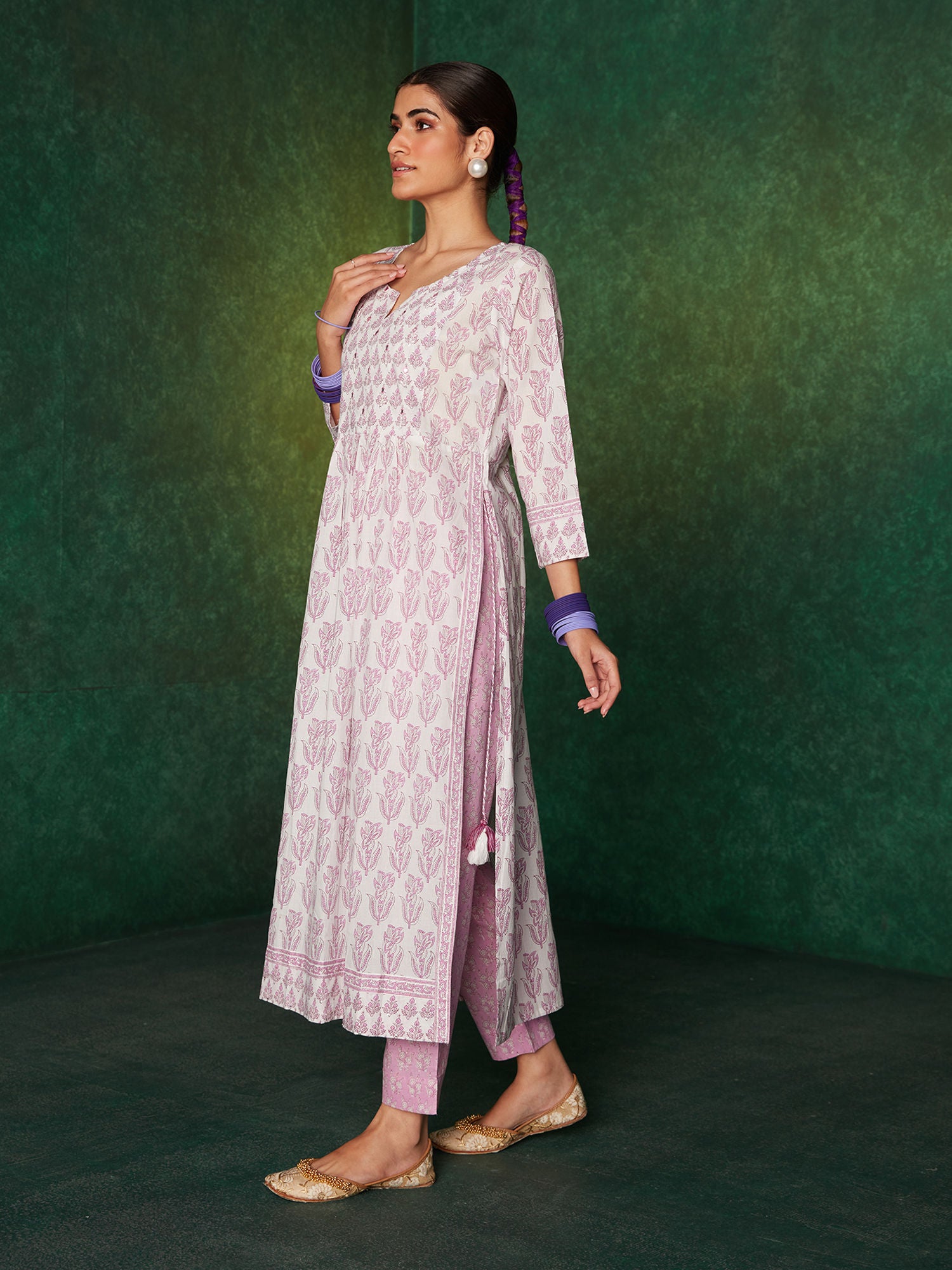 • Elevate your style with this Cotton Kurta Set in a charming shade of purple. The kurta features a combination of embroidery and sequins that adds a touch of sophistication to your look.