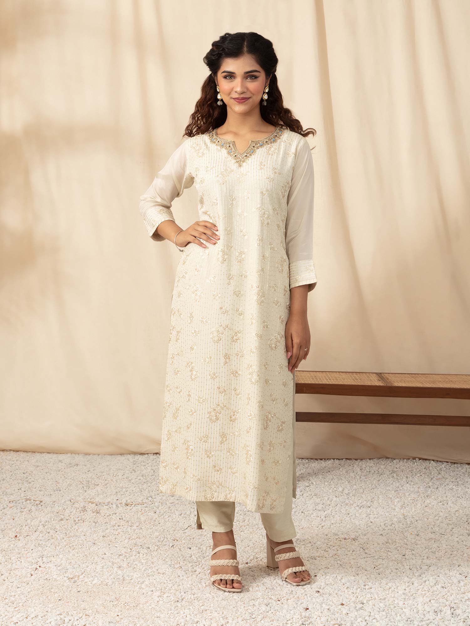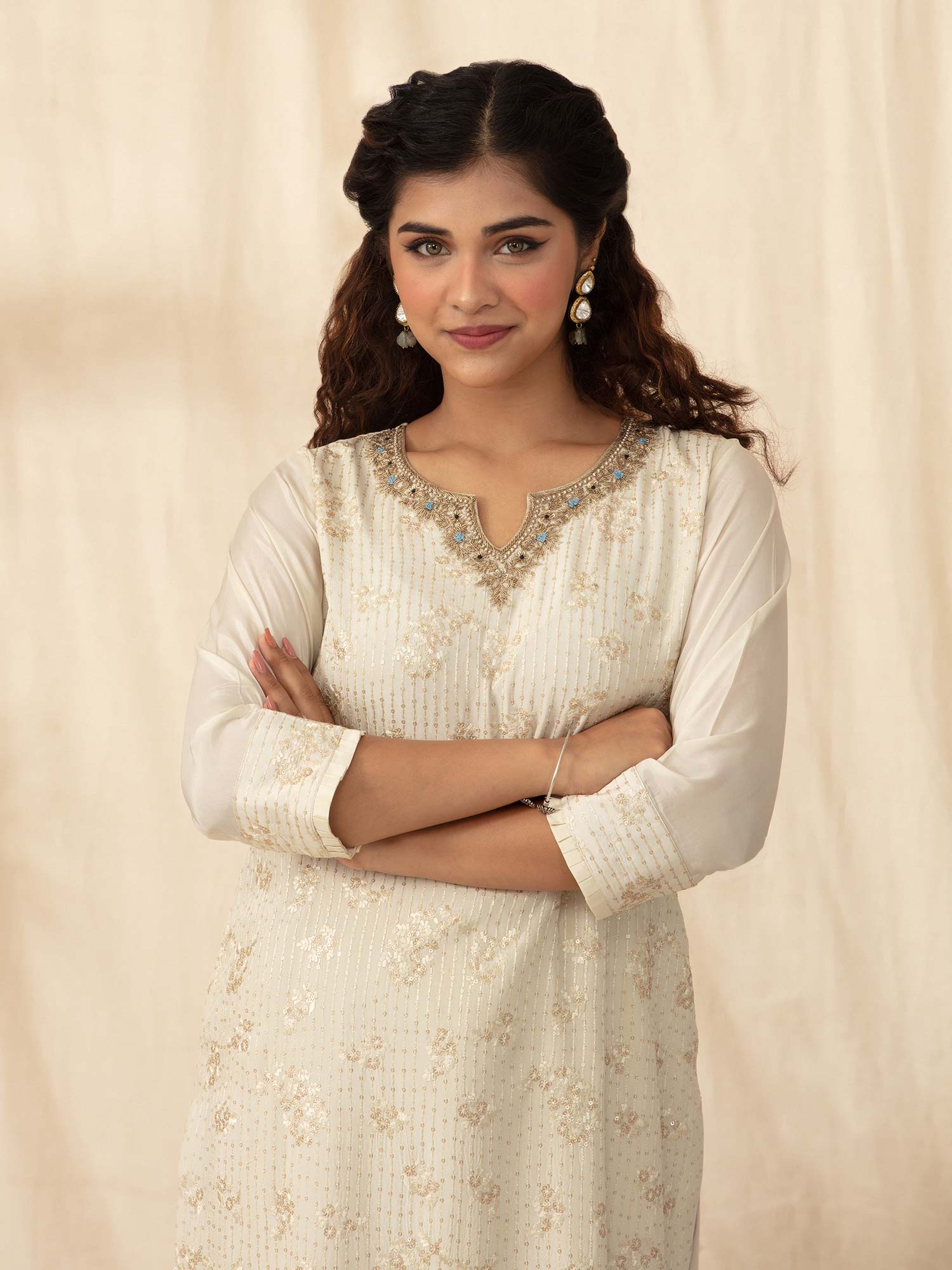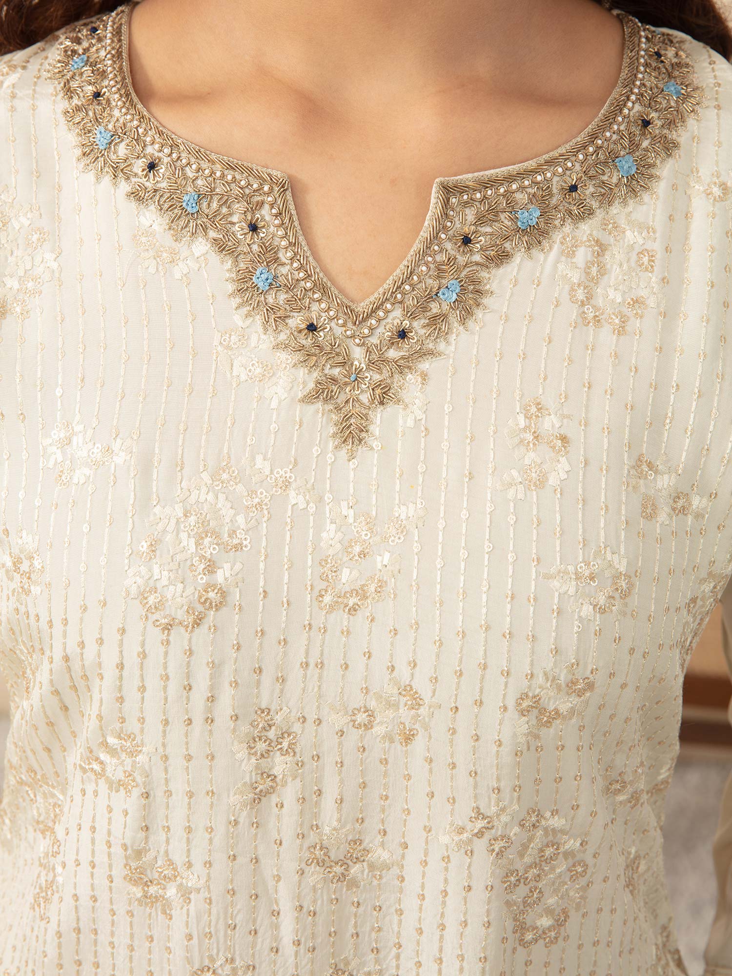 Likha Ivory All Over Embroidered Aline Kurta Pant Set Dupatta LIKSKD58 (Set of 3) - L