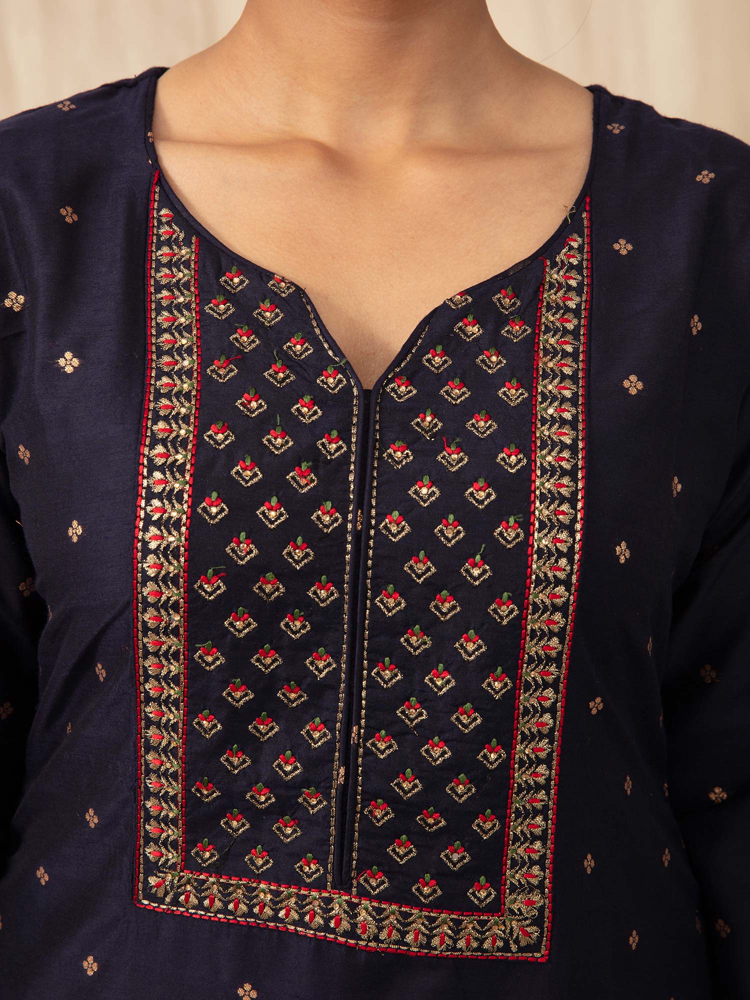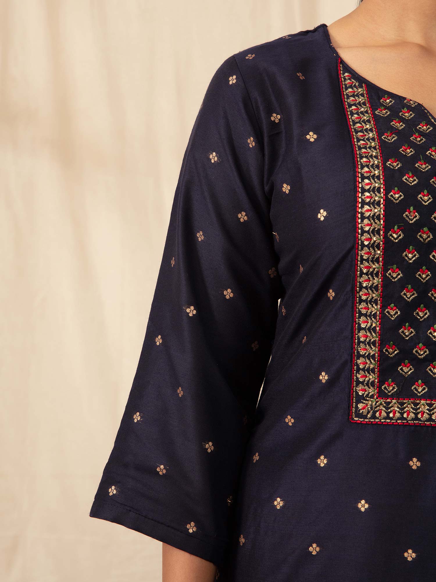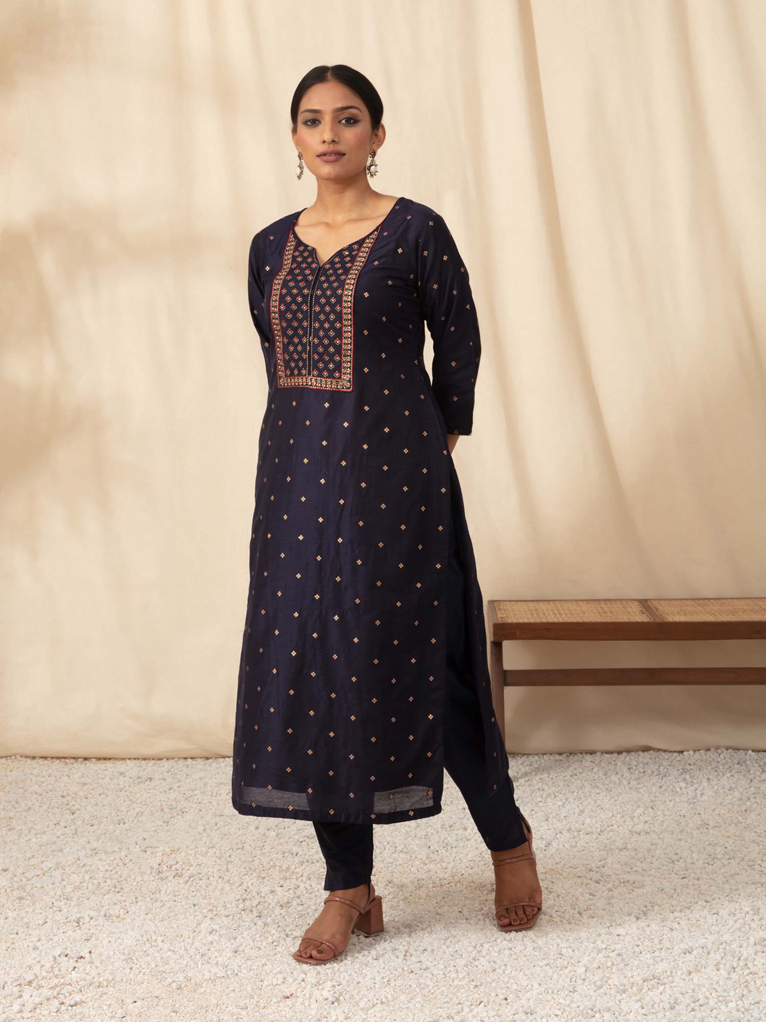 • The comfortable fit, three-fourth sleeves, and intricate embroidery create a regal look that can be further enhanced by pairing it with jhumkis, a potli bag, and juttis. This set is the epitome of elegance and sophistication, making it a perfect choice for various events.