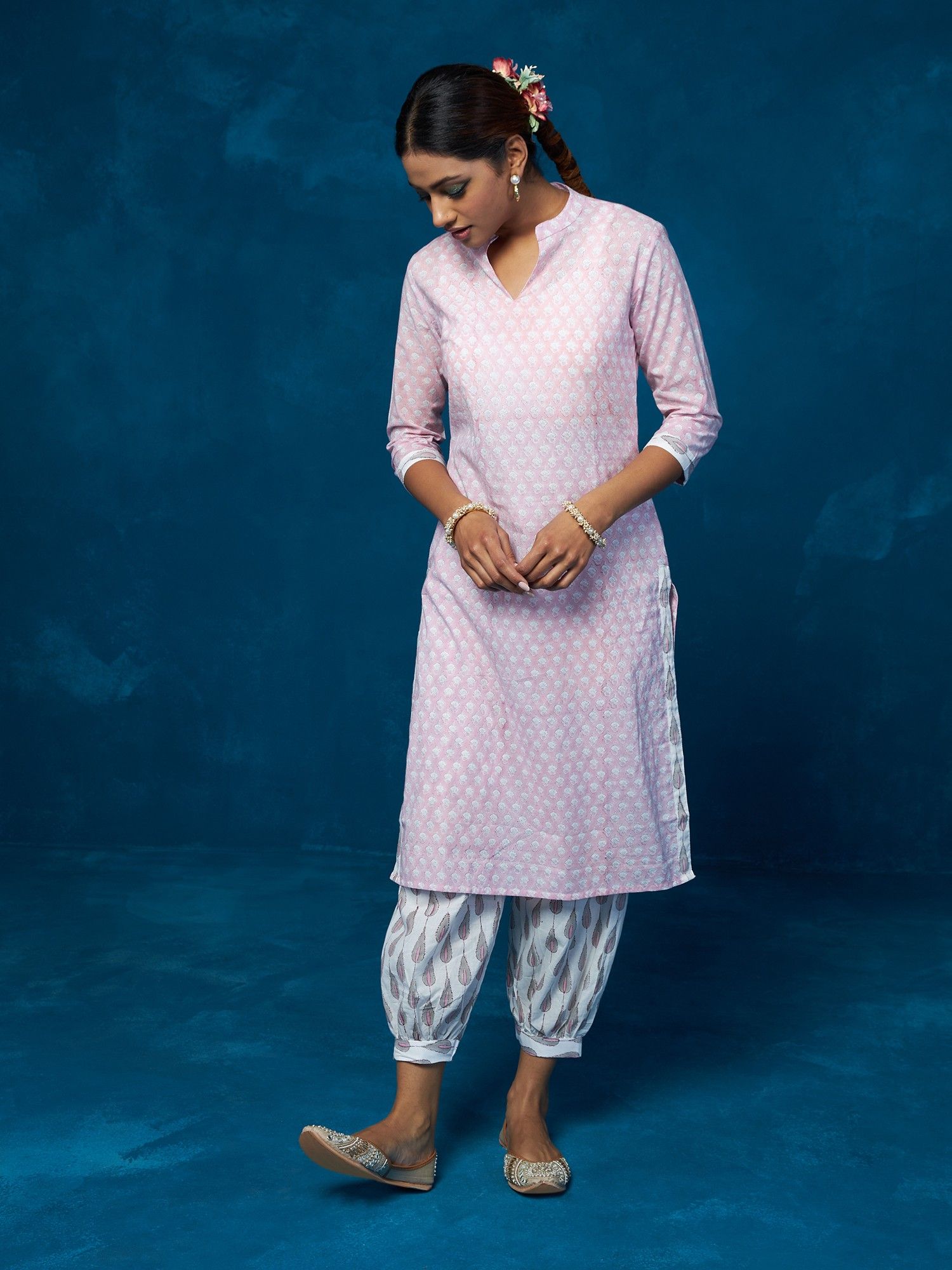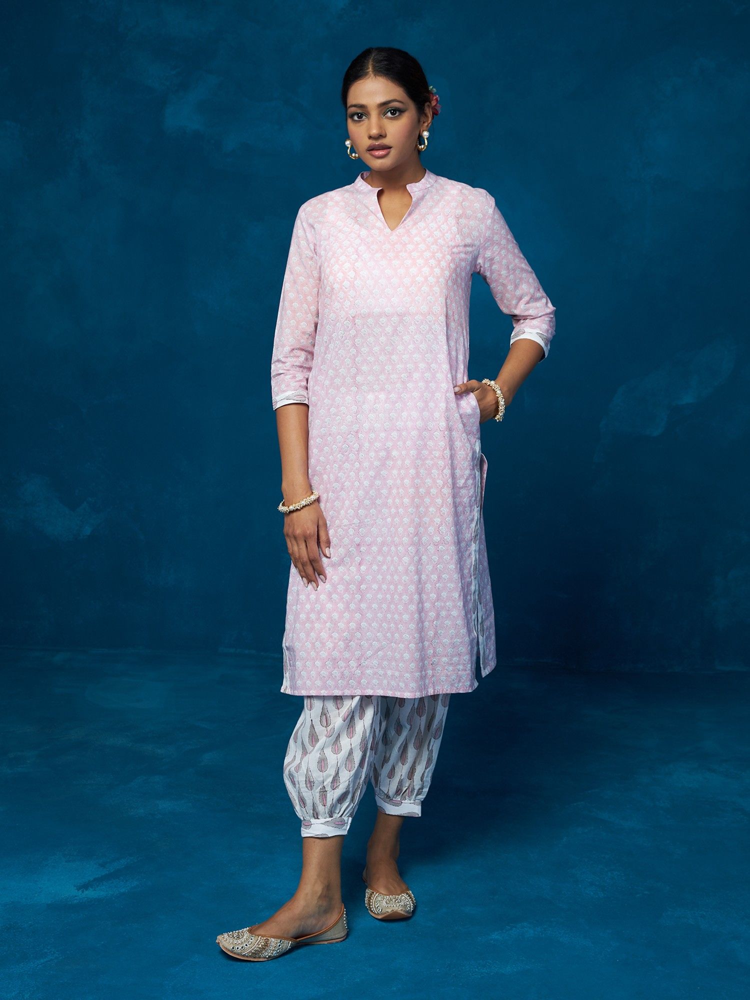 • Embrace casual elegance with this printed cotton kurta set featuring a comfortable slip-on design and a stylish mandarin neck. Perfect for various occasions.