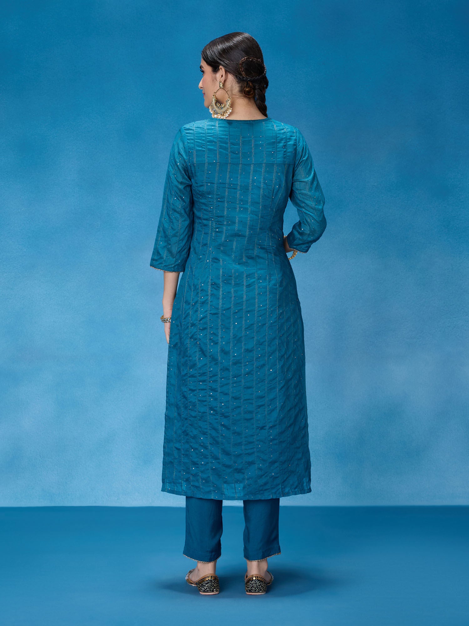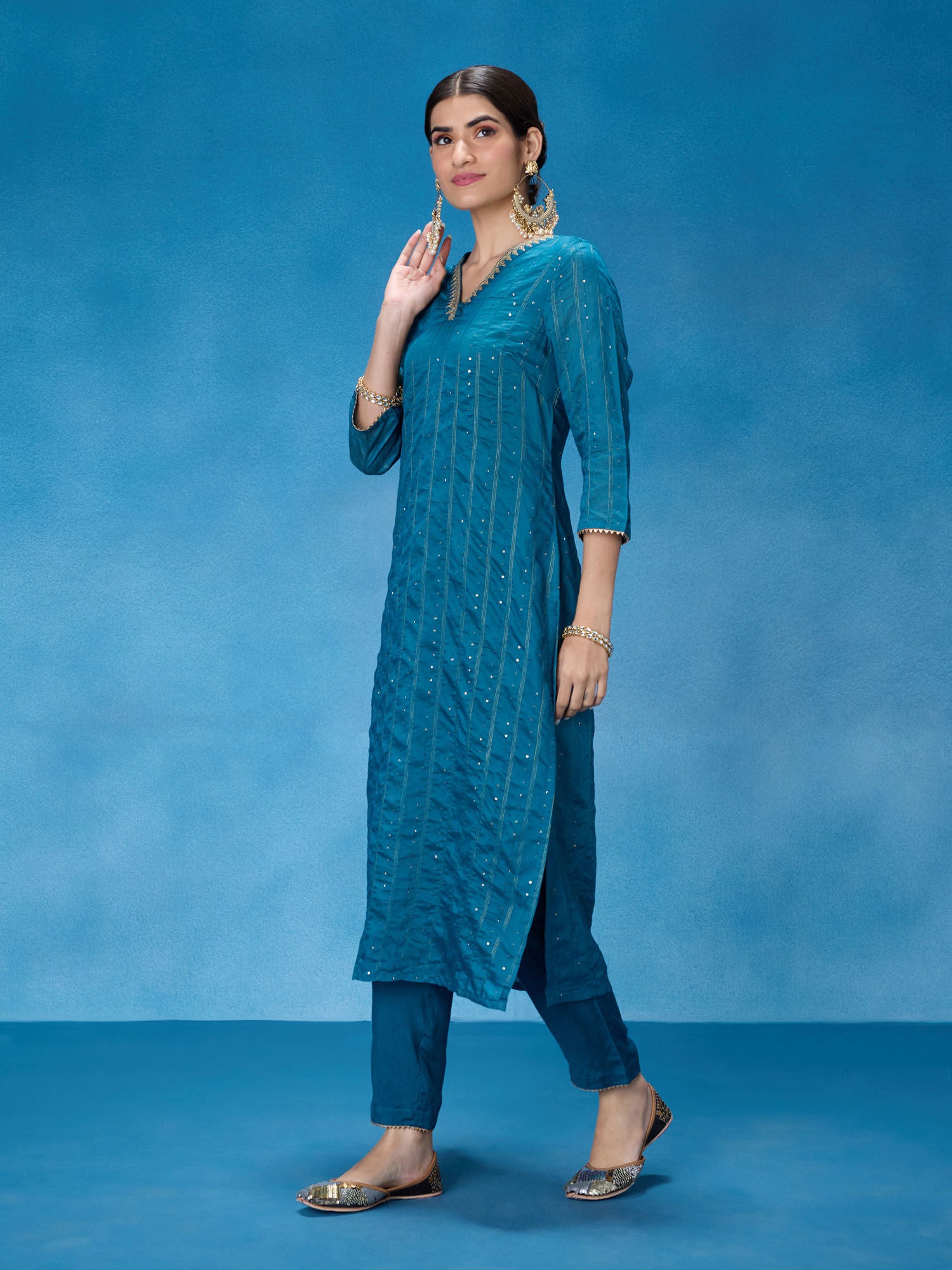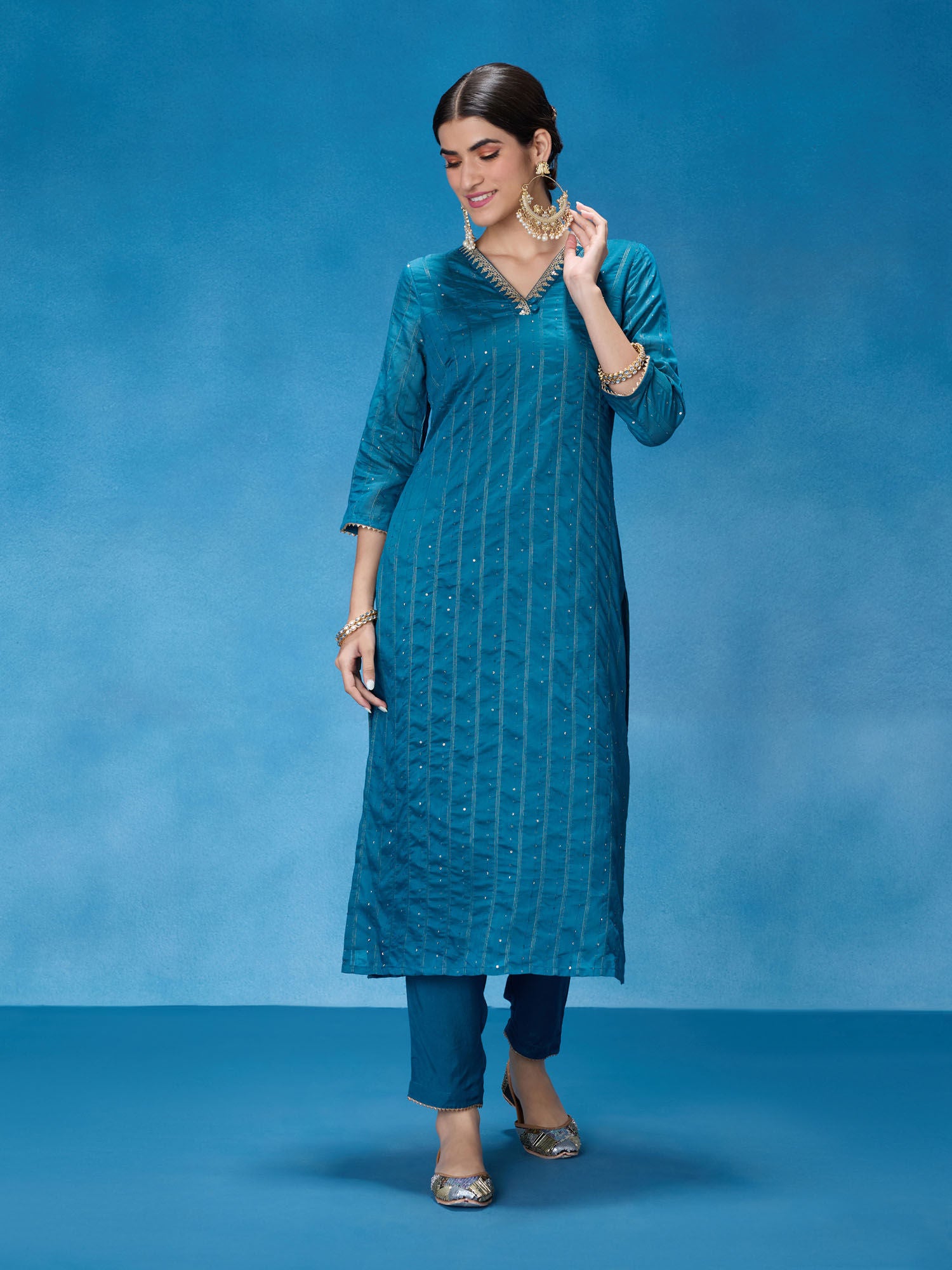 • Elevate your festive look with this embellished and sequined kurta set. Designed to dazzle and make a statement, this set is perfect for special occasions. The intricate embellishments and sequins add a touch of glamour and elegance to your ensemble. The three-fourth sleeves and V-neckline enhance the traditional yet stylish look. This set also includes comfortable and coordinating pants to complete the outfit.