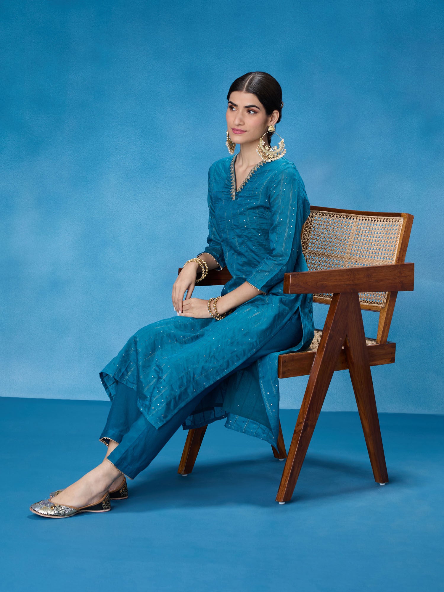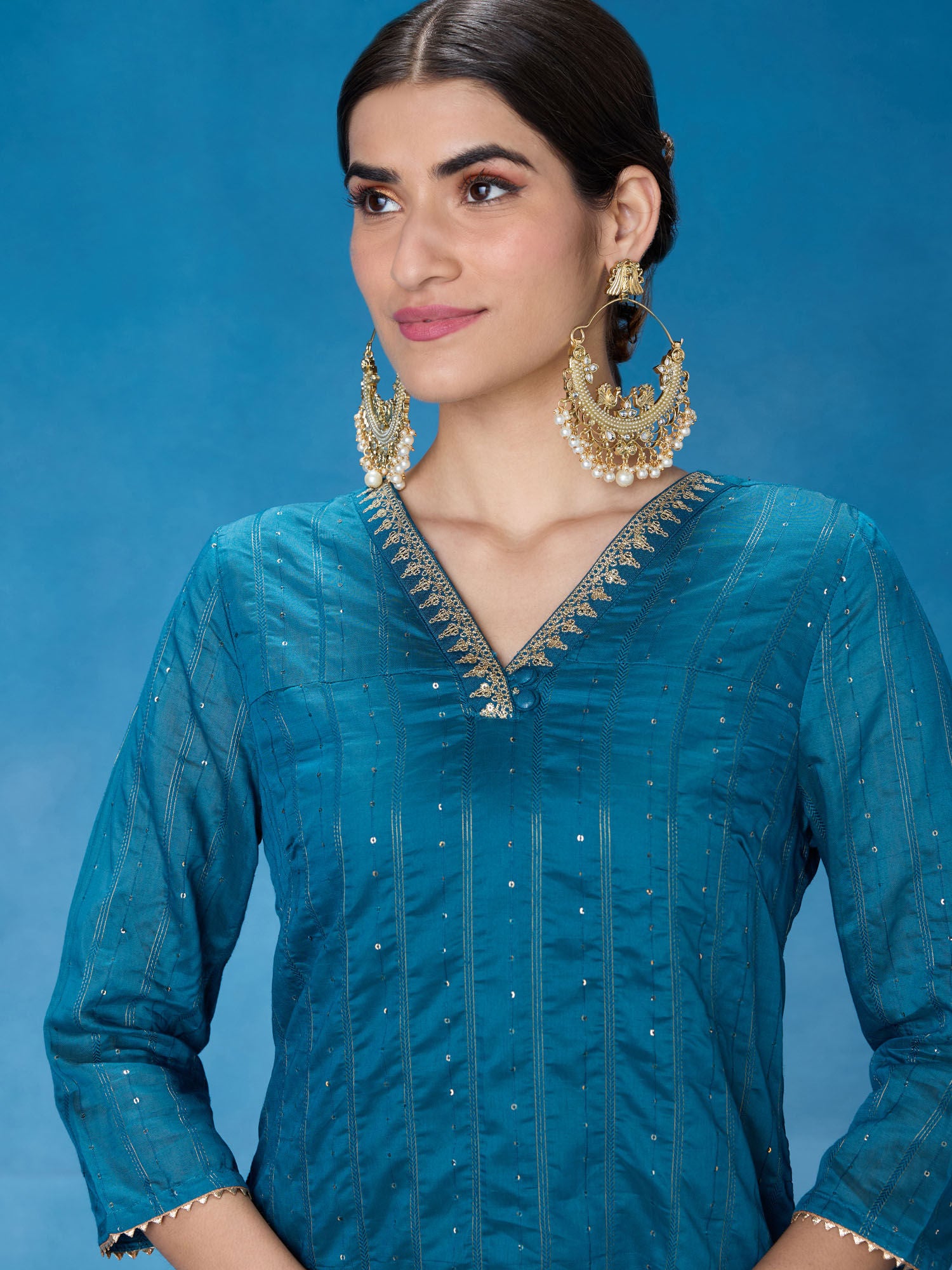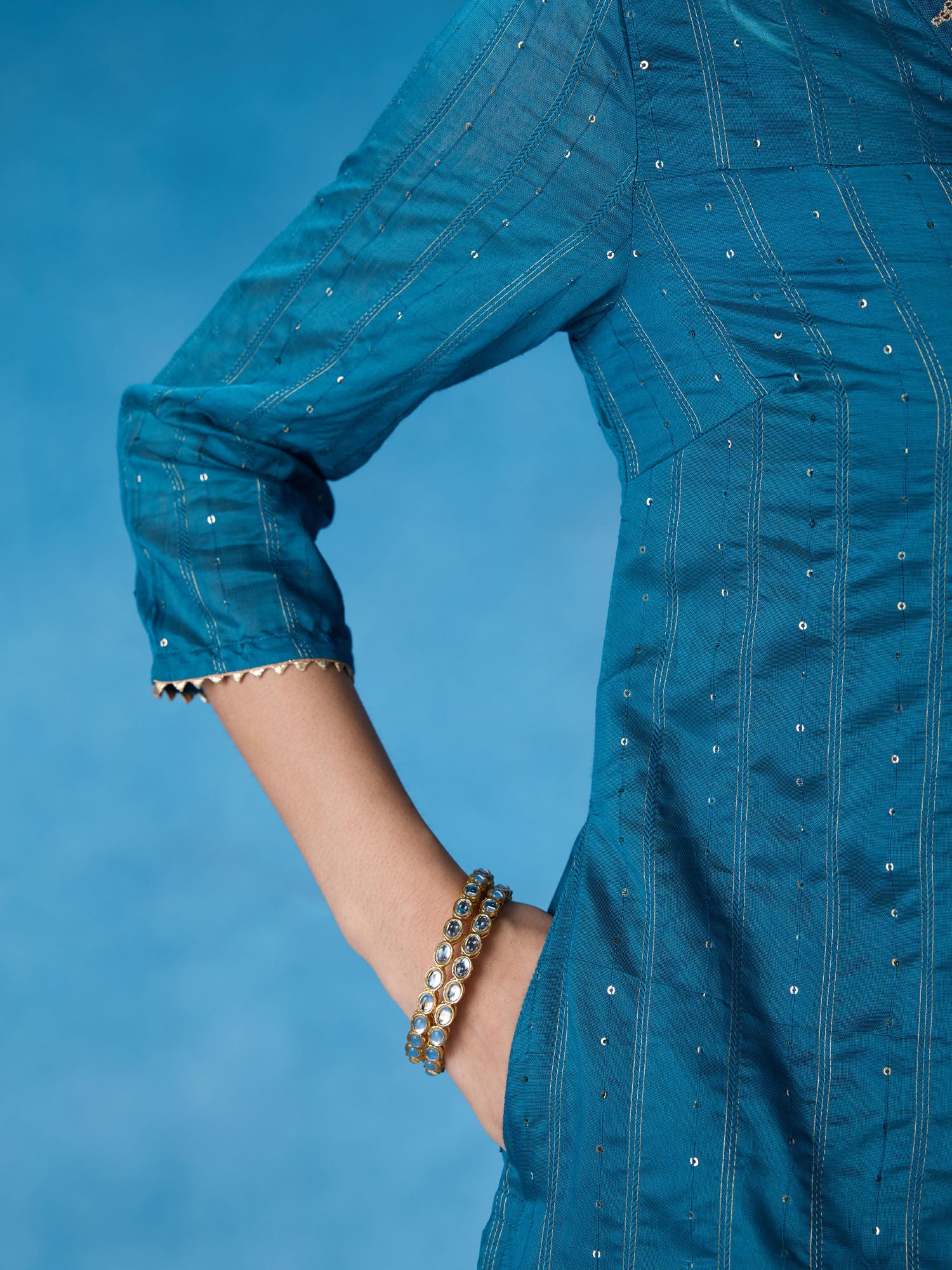 • Elevate your festive look with this embellished and sequined kurta set. Designed to dazzle and make a statement, this set is perfect for special occasions. The intricate embellishments and sequins add a touch of glamour and elegance to your ensemble. The three-fourth sleeves and V-neckline enhance the traditional yet stylish look. This set also includes comfortable and coordinating pants to complete the outfit.