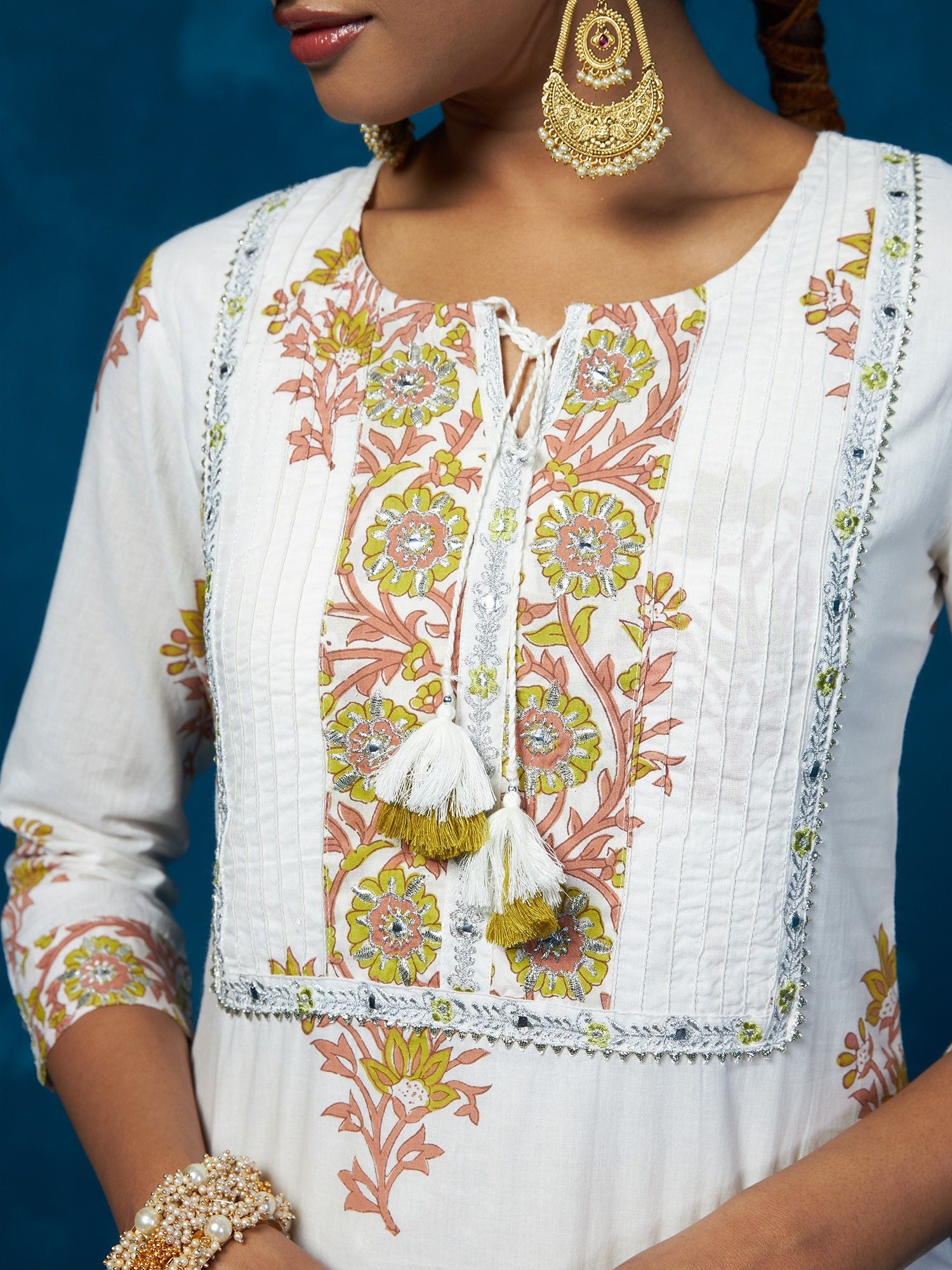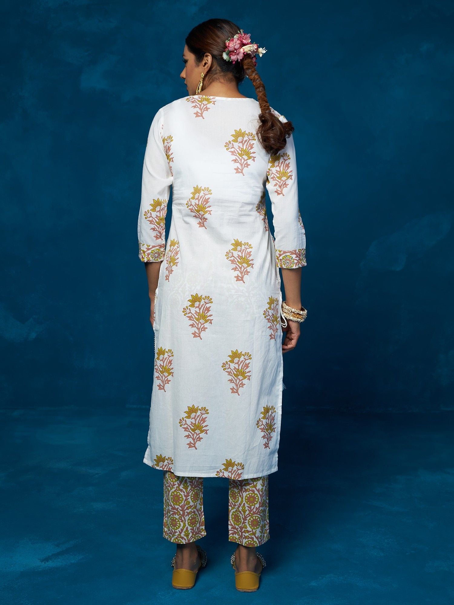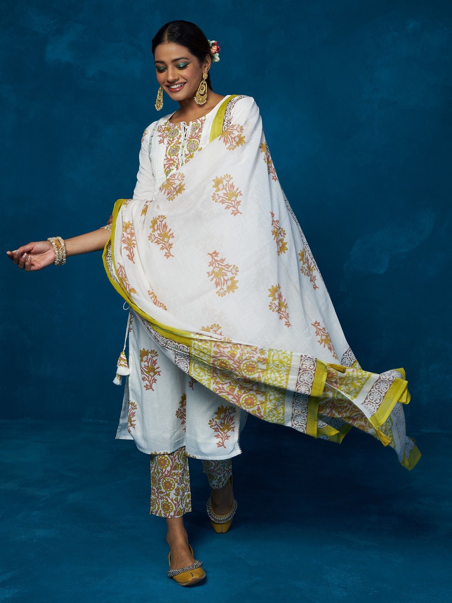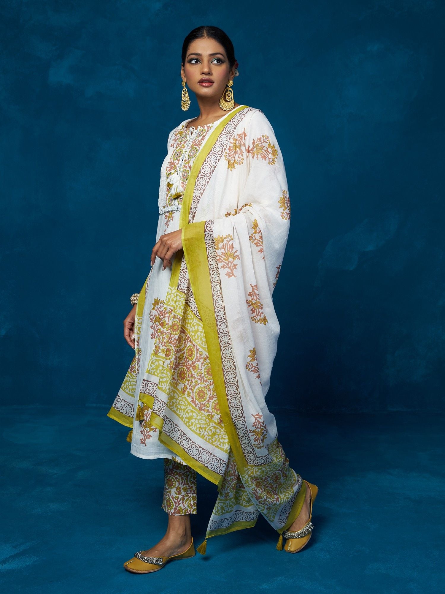 Likha White Block Printed & Mirror Work Kurta, Pant & Dupatta LIKSKD84 (Set of 3)