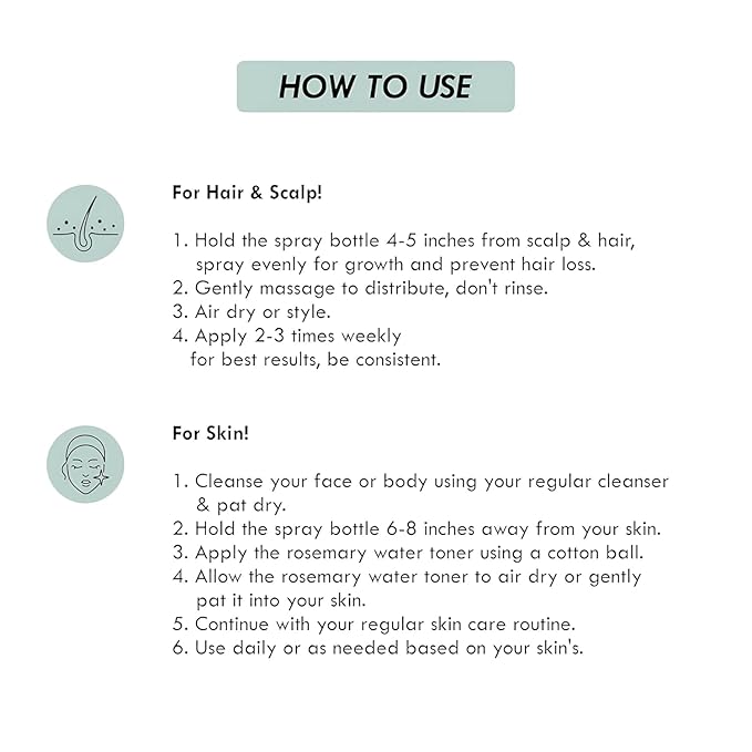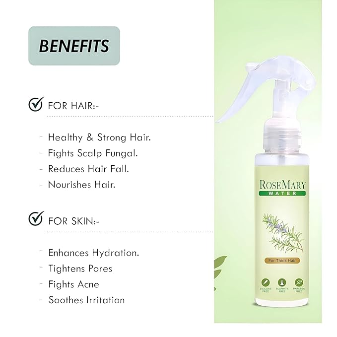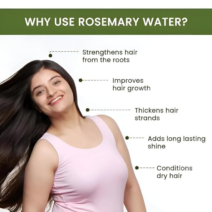 • Multipurpose Benefits: Rosemary Water enhances hair growth, adds shine, tames frizz, and reduces hair fall.