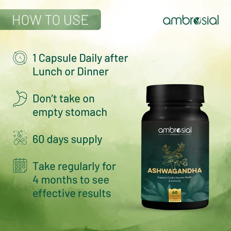 • Ambrosial’s Ashwagandha Capsules are made from 100% pure, natural, and edible herbs in the most hygienic way. It has therapeutic characteristics such as anti-inflammatory effects which may help improve your cardiovascular health.