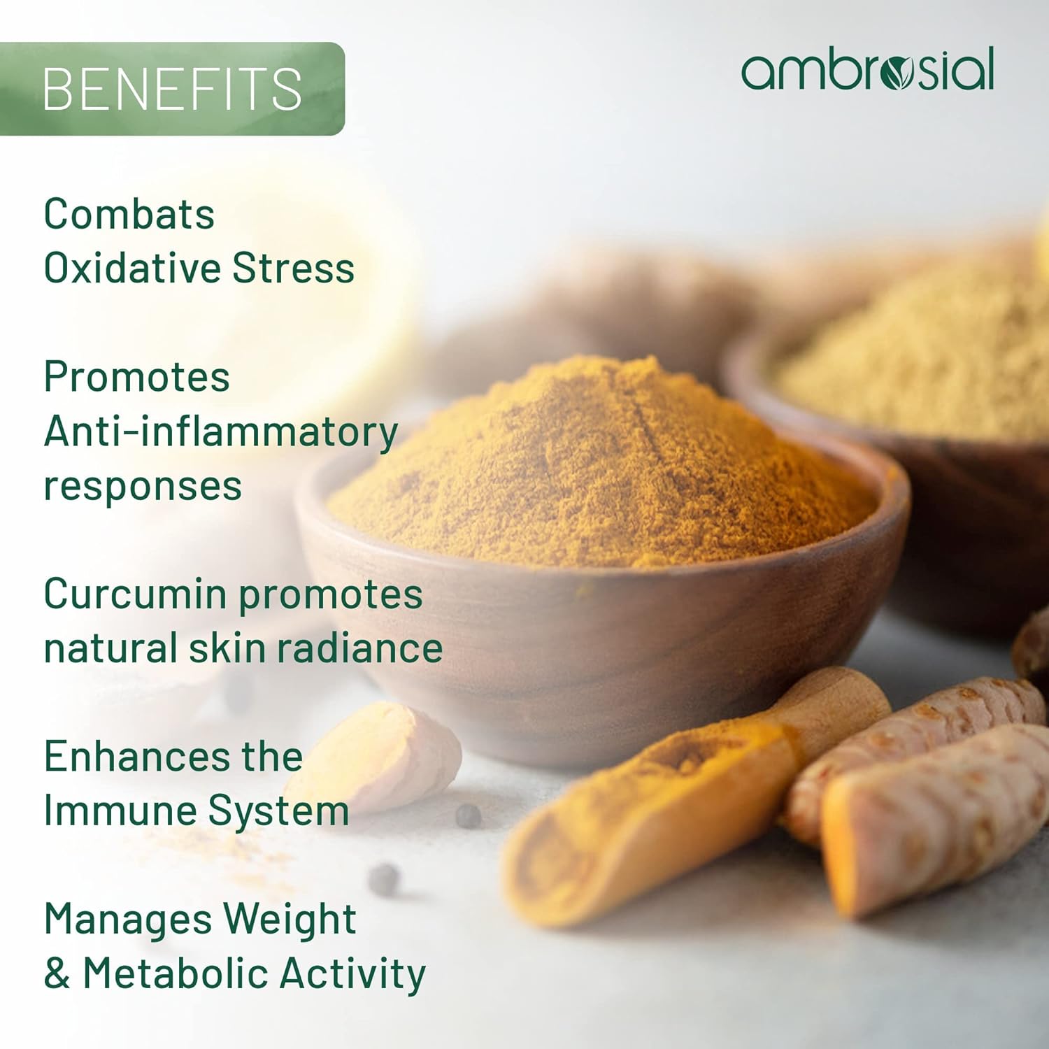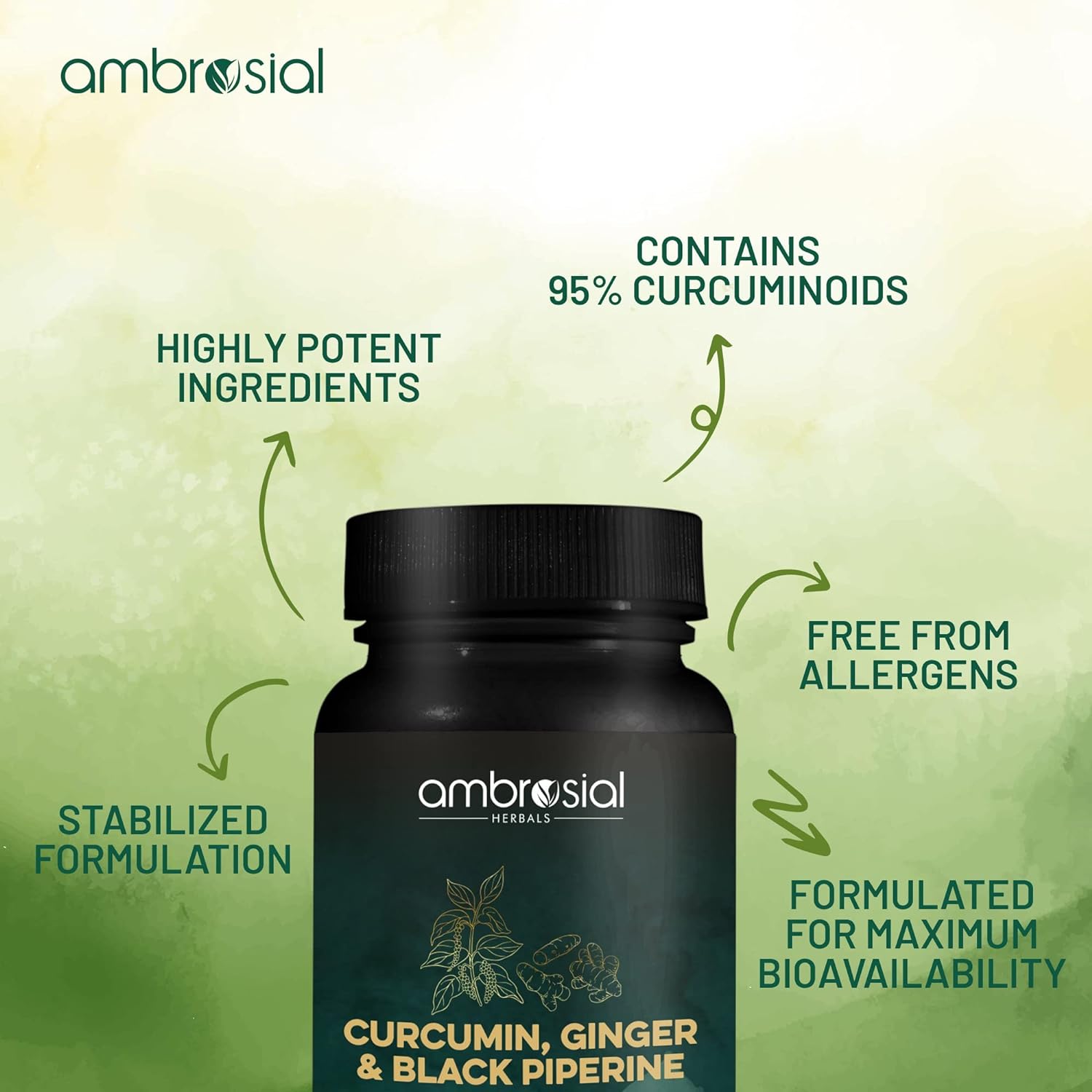 • WHY AMBROSIAL: Ambrosial Veg curcumin capsules have highest 95% standardized curcuminoids extract along with Ginger & Black Pepper that provides as much as 2000x better absorption than consuming turmeric capsules alone