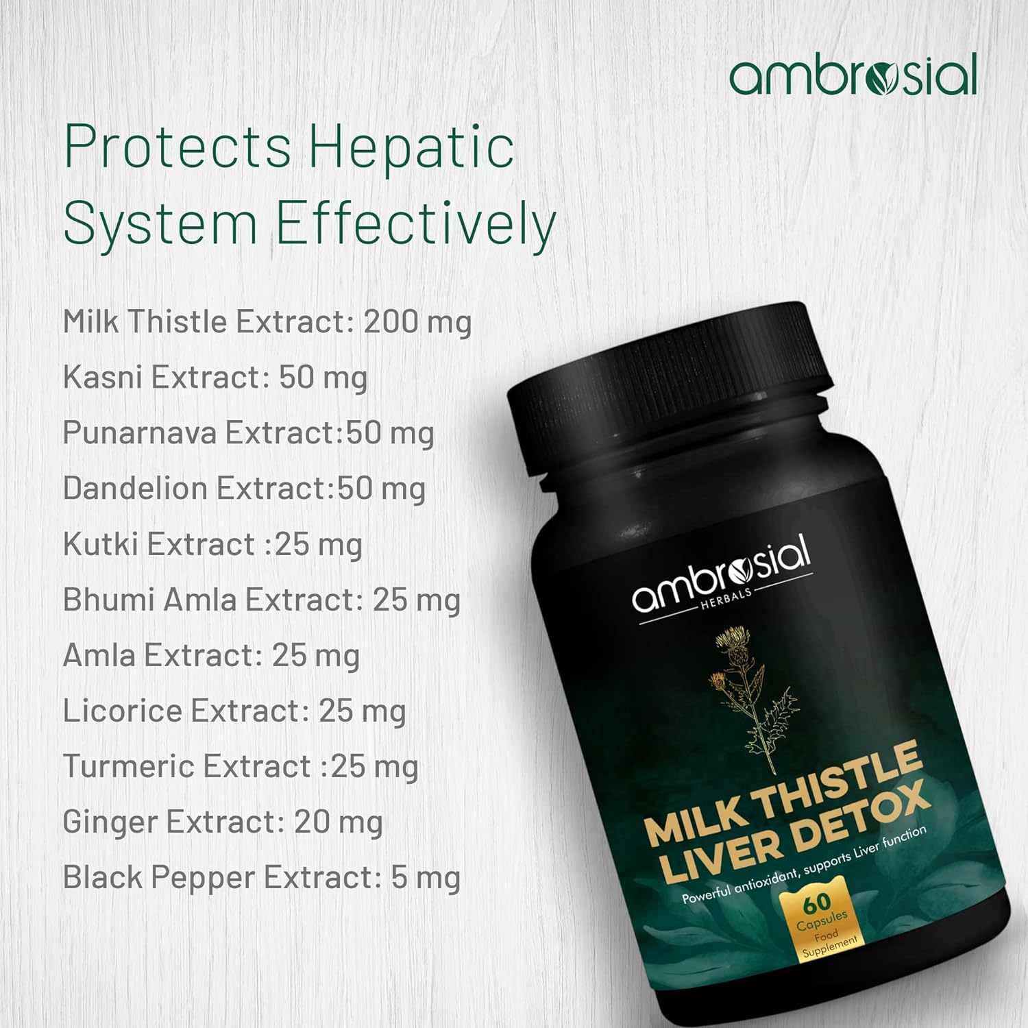 • WHY AMBROSIAL MILK THISTLE: Ambrosial Milk Thistle is premium blend of 11 natural herbs along with milk thistle extract it also contains Dandelion root extract, Amla, Turmeric, Ginger, Licorice & more along with Black Pepper that helps in enhanced absorption.