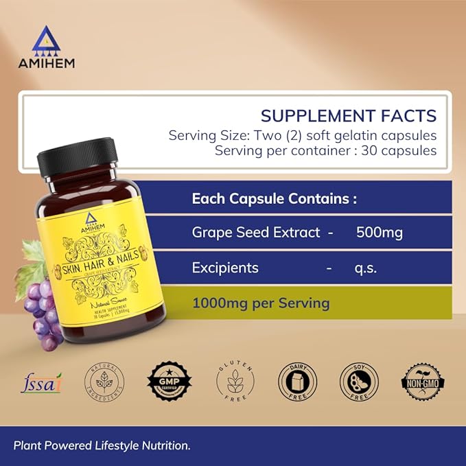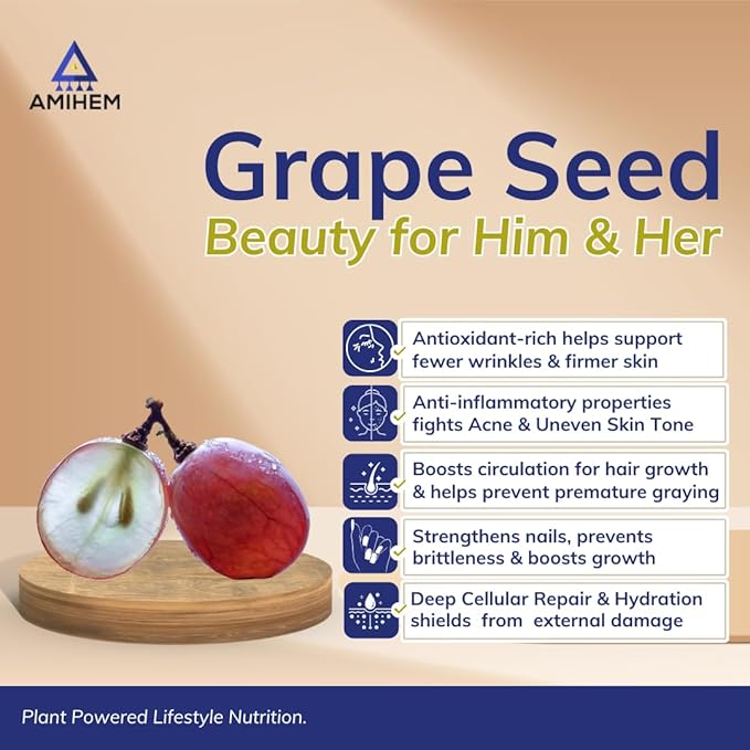 • π—”π——π—©π—”π—‘π—–π—˜π—— π—¦π—žπ—œπ—‘ 𝗣π—₯π—’π—§π—˜π—–π—§π—œπ—’π—‘ & π—–π—’π—Ÿπ—Ÿπ—”π—šπ—˜π—‘ 𝗕𝗒𝗒𝗦𝗧 – Rich in > 99% polyphenols , AMIHEM Grape Seed Extract neutralizes free radicals, preventing collagen breakdown and stimulating new collagen production for firm, youthful skin with fewer wrinkles.