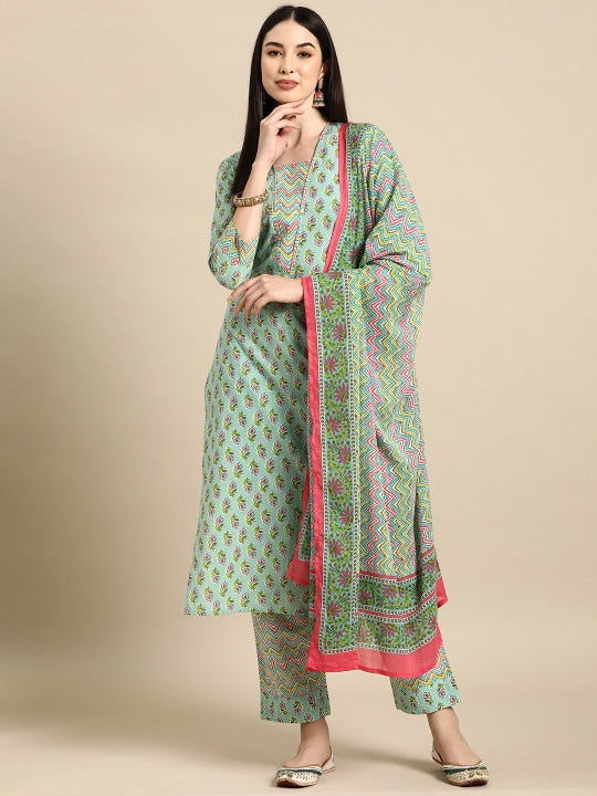 Anayna Women Floral Printed Pure Cotton Kurta with Trousers & With Dupatta