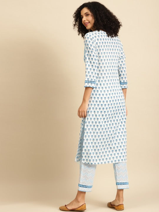 • White and blue printed straight calf length kurta, has a round neck, three-quarter sleeves, straight hem, side slits