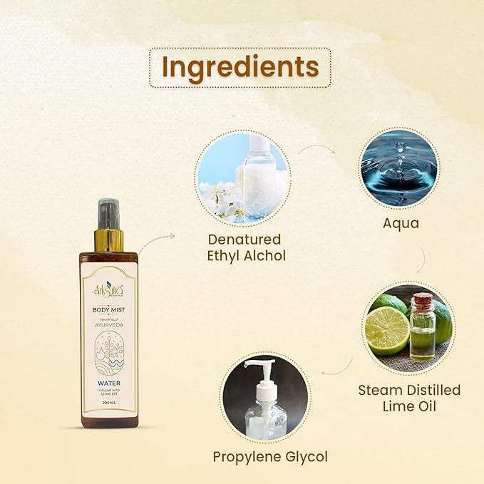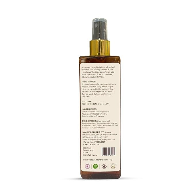 • Ingredients- Our Water Body Mist is made using pure steam distilled Lime Oil. We do not use any chemical or synthetic ingredients for fragrance.