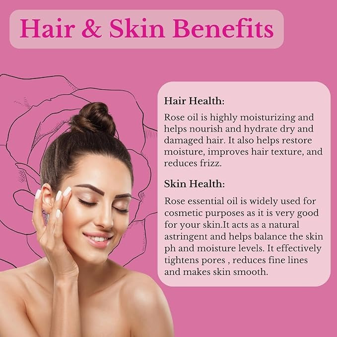 • SKIN CARE & HAIR GROWTH:Rose essential oil is widely used for cosmetic purposes as it is very good for your skin. It can help you fade away scars left over from acne, boils, pox, and injuries and leave you with smooth skin. It can even help you fade away stretch marks, fat cracks, scars from surgeries, and so on. The antioxidant properties of this oil help with healing your skin quickly. It promotes hair growth and works like a eau de parfum for body.