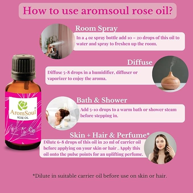 • AROMATHERAPY USAGE : It has rich sweet subtle & floral rose aroma, adding few drops in the diffuser humidifier Or burner calms the senses & refreshes the soul and mind.Rose oil boosts self-esteem, confidence. Helps Reduces stress and tiredness